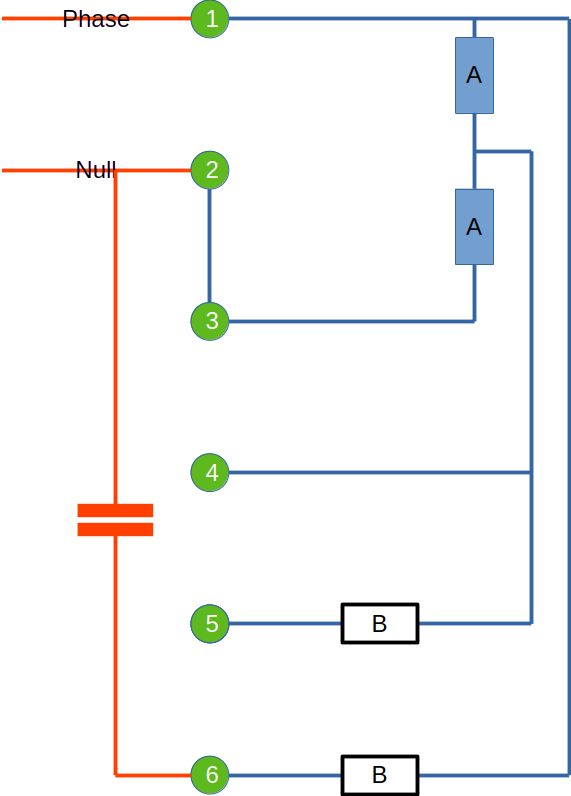Michael B. schrieb: > Wenn du an das Bild > > https://www.mikrocontroller.net/attachment/645843/Bild.webp > > die Leitungen zu Netz (L), TRIAC (N) und den Kondensatoren einzeichnest, > wird es wohl klarer. > > Konnte man verwenden für 115V/230V Umrüstung. Ich denke das ist könnte die Lösung sein (siehe neues Bild). Der Motor kann mit 220V/110V betrieben werden. Die Wicklungen A sind dann entweder in Serie oder parallel geschaltet - und es fließt aber immer der gleiche Strom durch. Der Strom in Wicklung B wird mit dem Kondensator verschoben und hätte in der Parallelschaltung nur die halbe Spannung -> daher bei 110V die doppelte Kapazität. Die Schaltung 220V oder 110V erfolgt beim Hersteller. Was mir noch nicht 100% klar ist: bei Parallelschaltung fließt der Strom in den beiden Wicklungen A1/A2 in die entgegengesetzte Richtung - sollte aber die gleiche Drehrichtung haben. Hängt jetzt von der Anordnung der Wicklungen ab. Alles Vermutungen.