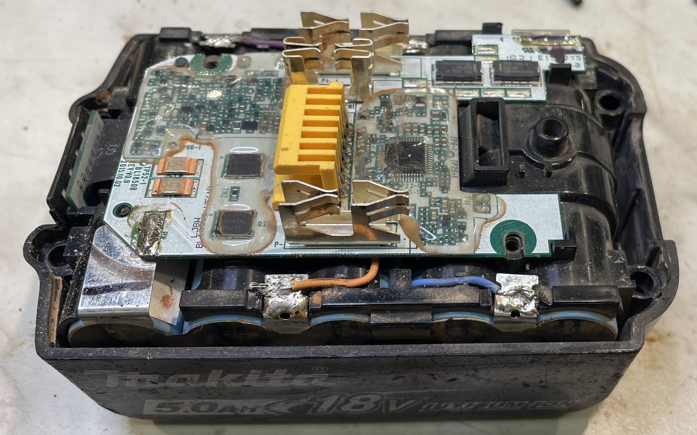 Seltsamerweise hat ausgerechnet Parkside/Lidl bei allen Akkus mit dem BMS auch einen echten Balancer verbaut, siehe Bild (links neben dem Shunt die 510 Ohm Widerstände und die kleinen MOSFETs). Bisher nie ein Problem damit gehabt. Bei Makita Originalakkus ist der Balancer im Ladegerät, angeschlossen über die 7-polige gelbe Steckerleiste (Bild). Die Nachbauten haben zwar die Steckerleiste aber intern keine Beschaltung dafür; entsprechend früher fallen die dann aus.