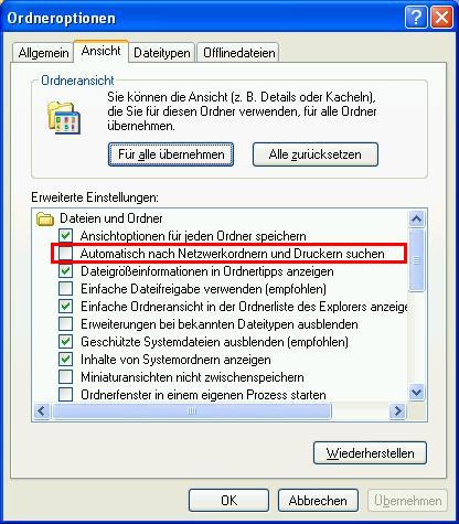 Hallo! Ich hab bei meinem Firmenlaptop ein kl. Problem: Wenn ich unterwegs oder von zu Hause aus nicht mit dem Firmennetz verbunden bin, so hat mein X-Laufwerk (das zu einem Server zeigt) logischerweise keine Verbingung. Wenn dies so ist, brauchen sämtliche Öffnen/Speichern-Dialoge teilweise über 1-2 Minuten, bis ich in den Ordnern auf der HDD "rumspringen" kann. Teilweise dauert jeder 2-3 Sprung wieder 1-2 Minuten. :( Ziemlich nervig hald. Wenn das Netzlaufwerk hardwaremässig verbunden bzw. wenn ich das Netzlaufwerk im Explorer trenne, so geht alles ratz-fatz. Auch welchem Grund auch immer, stört sich XP am nicht erreichbaren X-Laufwerk. Kennt jemand einen Trick, dass sich XP nicht immer so lange am nicht verbunden Netzlaufwerk stört? Im Moment hab ich als Workaround 2 batch-Files angelegt, um das Netzlaufwerk verbinden und trennen zu können. Bin für jeden Tipp dankbar! Gruß, Techniker