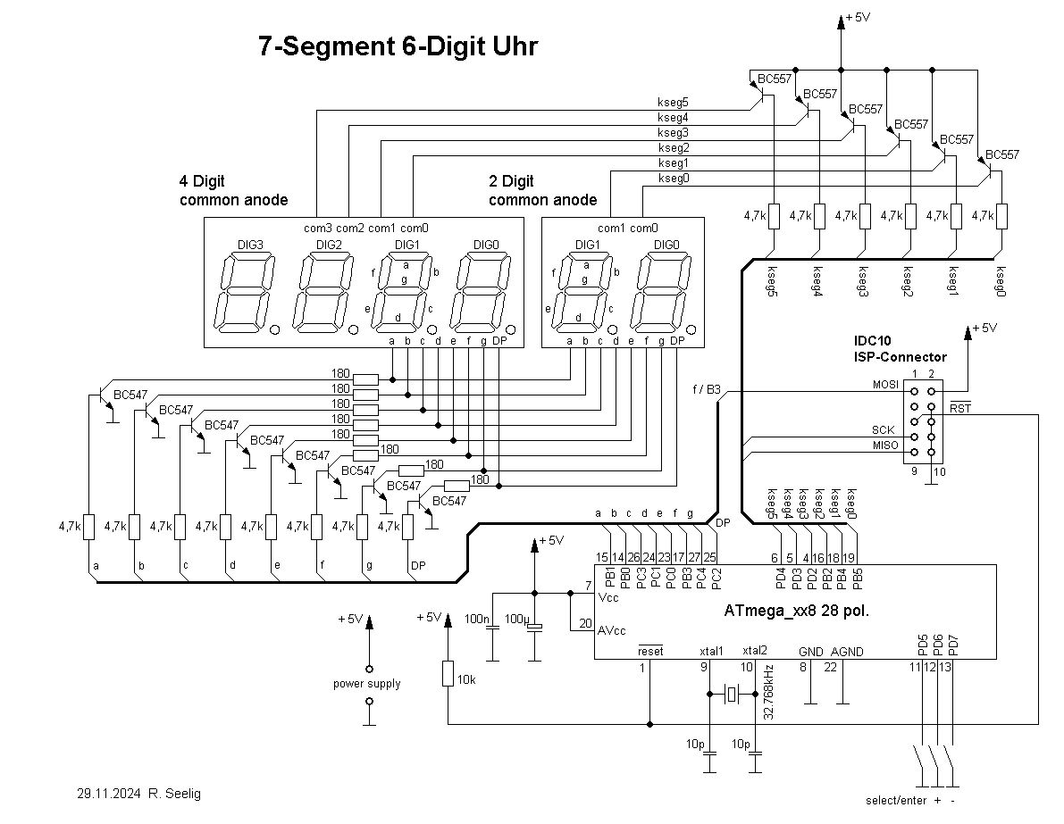 So, auch wenn das wohl etwas "spät" im Thread jetzt ist, hat es mich doch "gepfupfert" gehabt, eine LED-Uhr aufzubauen (und witzigerweise habe ich festgestellt, dass ich eine 7-Segmentanzeigen-Uhr niemals "fertig" gemacht hatte, immer nur "BCD-Uhren"). Also: 7-Segment-Uhr mit ATmega328p die Hundertausendste! Auch wenn das in der Rubrik "Projecte & Code" wohl besser passen würde, poste ich das hier zum Thema, weil ich denke, dass es 7-Segmentuhren wohl irgendwo zu Hauf geben wird und "meine" Uhr ist dann wohl die 10.001 ... oder auch 100.001 (wie auch immer). Ich habe jetzt mal im Schnelldurchgang versucht, die Uhr (und die Funktion) zu beschreiben, damit der TO hier evtl. doch etwas damit anfangen kann, auch wenn "meine" Uhr wohl nicht der klassischen ersten Uhr entspricht, die man so programmiert. Diese Uhr hier hat eine Kalibrierfunktion, um die Ungenauigkeit des Uhrenquarzes (ich verwende einen 32.768 kHz Quarz und leite den Uhrentakt NICHT vom Takt des Systems ab) auszugleichen. Die Uhr hier kann: - auch Datum anzeigen - Helligkeit der Anzeige variieren - den Anzeigemodus wechseln (Uhrzeit permanent, Uhrzeit / Datum im Wechsel) Alexander H. schrieb: > Wahnsinn, wie man eine Uhr alternativ auch noch bewerkstelligen kann. > Mir würde aber ein genauer (Uhren-)Quarz zur Takterzeugung oder ein RTC > (teilweise störanfällig?) ausreichen. > Die Ausgabe soll in HH-MM-SS erfolgen (ein 8 digit display). > Die Anzeige von Datum, evtl. Countdown und Stoppuhr wären natürlich auch > klasse. Leider sind die im Netz präsentierten Uhren öfters > fehlerbehaftet, laufen zu schnell/zu langsam (wie man manchmal auf Blogs > lesen kann). > > Ob Attiny26 oder Atmega328 ist eigentlich egal. Wenn möglich wollte ich > den Atmega328 nehmen, da dann externe Ansteurungs ICs entfallen. Mit "Ansteuerung-IC" wie bspw. TM1637 wäre es weniger Aufwand als so. :-) um es gaaaaaanz richtig zu machen (hier wird es nicht so wirklich gerne gesehen, wenn treibende Multiplex-Pins direkt an einen Controller OHNE Transistoren gehängt wird, habe ich das jetzt mal wirklich hochklassisch mit Transistoren für Digits und Segmente gemacht). Wenn du hier noch mitliest: Schau es dir an (und den Code auch).