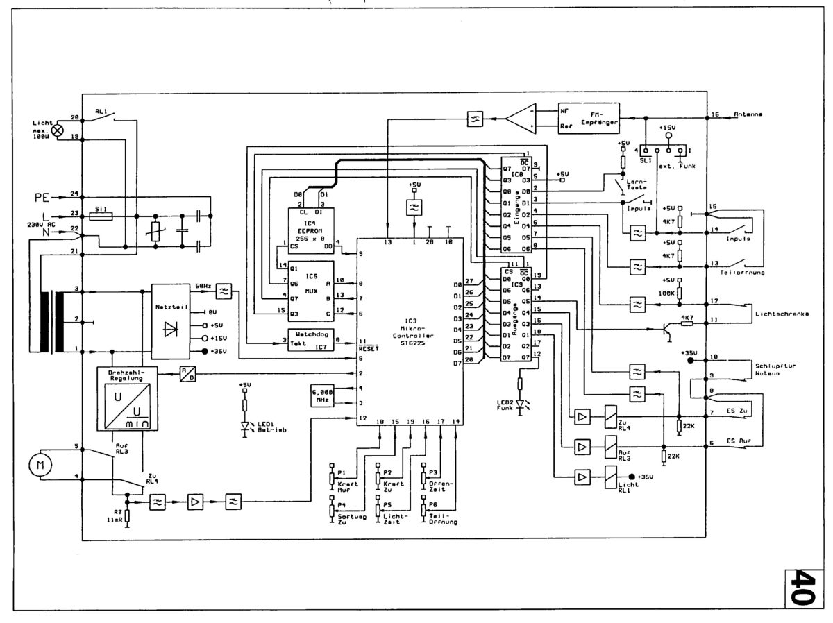 Gibt es von der ELEKTRONIK 2500 ein Schaltbild oder wenigstens ein Blockdiagramm? Ich versuche gerade die zwei Endschalter anzuzapfen, für eine externe Anzeige der Torposition. Ich habe 0V bzw. 27V gemessen. Die Frage ist, ob einer der Kontakte ein GND ist und ich den anderen dann als Signal verwenden kann oder ob beide Kontakte von GND verschieden sind (und ggf geschaltet werden). Gruß Uli