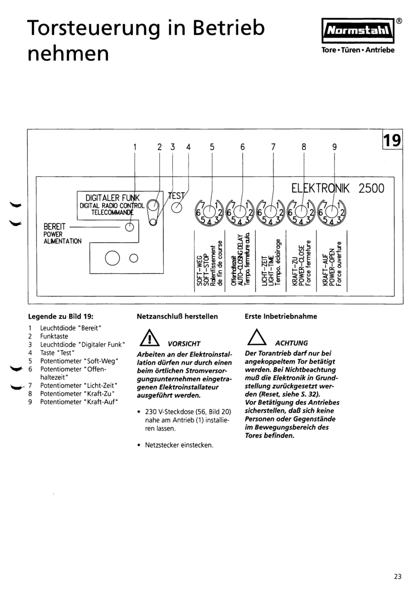 Uli schrieb: > Gibt es von der ELEKTRONIK 2500 ein Schaltbild oder wenigstens ein > Blockdiagramm? Hi, ich hab mich hier jetzt mal angemeldet, da ich aktuell vor einer Woche genau das selbe hier beschriebene Problem mit meinem *"Normstahl Tandem 3 SST mit Elektronik 2500"* hatte. Umgebung: - Außentemperatur < -5°C - Temperatur in der Garage ebenfalls knapp um den Gefrierpunkt Symptome: Betätigung der Öffner- / Schließer-Taste (egal ob via FB, ext. Taster oder Taste "Test" am Antrieb) führt zu einem kurzen Ruck / Anspringen des Motors und einem Aufblinken der Beleuchtung. Danach Blinken der roten Leuchtdiode(3) "Digitaler Funk". Der ganze Vorgang ist replizierbar und führte immer zum selben Ergebnis. Keine Funktion des Antriebs mehr gegeben. Ursachenanalyse: Ich hab daraufhin die Elektronik gezogen und zunächst im warmen Bastelkeller erst einmal auf kalte Lötstellen untersucht. - keine gefunden. Die Platine zeigte aber genau die selben Verfärbungen und anscheinend thermischen Belastungen um den großen Metallschichtwiderstand und die darunterliegende Z-Diode, wie sie auf den Bildern hier im Thread (1. Post usw.) zu sehen sind. Einen Defekt konnte ich aber nicht feststellen. Am nächsten Morgen habe ich die Elektronik 2500 wieder eingesetzt und erneut probiert. - und siehe da, EINWANDFREIE FUNKTION !?! Aber zu früh gefreut. Am späten Nachmittag ließ sich das Tor nicht mehr öffnen. - selbes Fehlverhalten wie oben. Für mich sah das jetzt nach einem Temperaturfehler von irgendeinem Bauteil aus. - im Büro / Bastelkeller = 21°C -- in der Garage derzeit um die 0°C Lange Rede, kurzer Sinn [Ergebnis und Fehlerbeseitigung] Ich habe die Elektronik mit Hilfe eines Heißluftföns und Kältespray im eingebauten Betriebszustand systematisch nach der Quelle und Auslöser dieses temperaturabhängigen Fehlverhaltens untersucht. Beim unterkühlen des großen ELKOs (ELNA 470µF, 50V) trat das Fehlverhalten auf, beim gezielten erwärmen des ELKOs (Fön hat eine kleine Düse womit ich gezielt temperieren konnte) war die Funktion des Antriebs wieder einwandfrei I.O. Ich hab den Elko dann kurzerhand ausgetauscht / ersetzt. Seitdem funktioniert der Antrieb wieder ohne weitere Probleme. Auch ein im Nachgang gezieltes Einfrieren mit Kältespray konnte keinen weiteren Ausfall provozieren. Für mich ist damit die Ursache gefunden und beseitigt. Ggf. hilft diese Beschreibung ja dem Einen oder Anderen bei selbiger Elektronik und ähnlichen Symptomen. PS: Im Anhang noch die originale "Einbau- und Bedienungsanleitung" für den "Normstahl Tandem 1-4" im PDF-Format, und als Bilder eine Auszug mit dem Schaltplan und dem Bedienpanel. // Peter