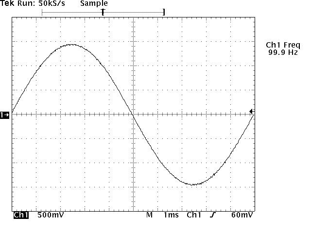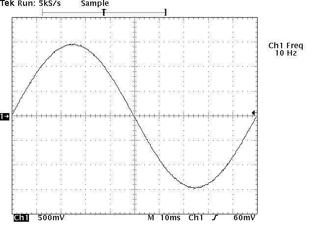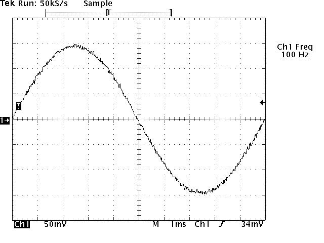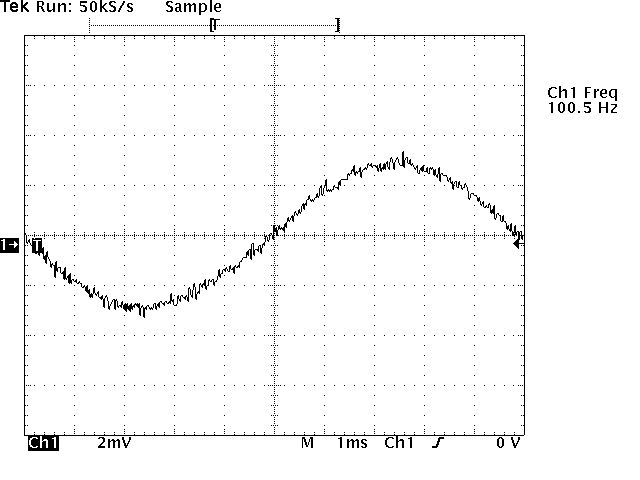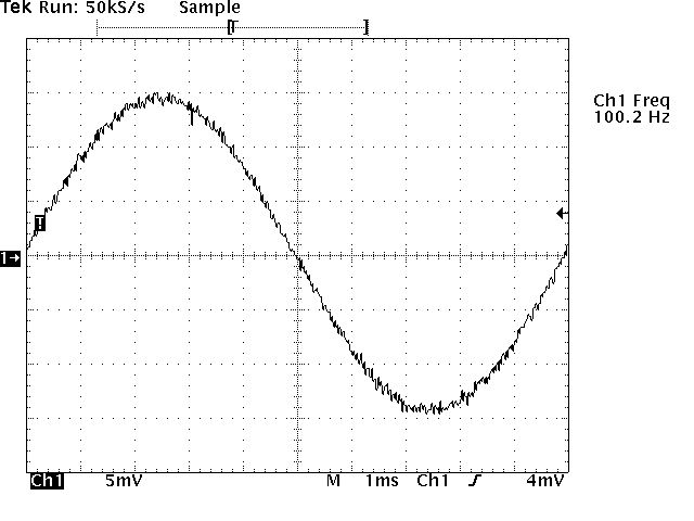Stimmt tatsächlich. Hier das Foto mit 2mV bei 100Hz, gemessen mit einem Analog-Oszi. Das Gezappel ist weg. Saubere Kurve.