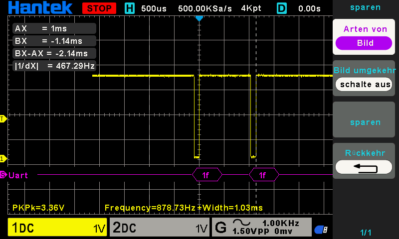 2 x 0xff vom PC gesendet. Das Osci erkennt 0x1f.
