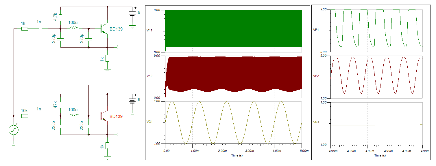 Ben B. schrieb: > Ich frage mich eher, wie das bei solchen Schaltungen ohne jeden Versuch > eines Ausgangsfilters mit den Nebenaussendungen aussieht Das habe ich mich auch gefragt, zumal man die totale Fehldimensionierung der Arbeitspunkteinstellung des BD139 sofort sieht. Im Anhang die Originalschaltung oben (grüne Kurven) und eine etwas geänderte Version unten (rote Kurven). Die geänderte Version ergibt eine wesenlich saubere HF, sehr viel mehr Modulationshub und braucht auch keinen NF-Verstärker vor der HF-Endstufe/Oszillator.
