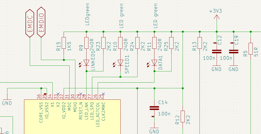 Letztendlich ist das alles Übungssache. Ich lerne am Besten von anderen - Kollegen, Freunden etc. Manches muss man auch selber falsch gemacht haben, um es zu lernen. Du wirst mehr als ein Layout in die Tonne treten, weil etwas nicht wie erwartet funktioniert. Das ist normal. Auf Youtube gibts auch Tutorials, zum einen von dem Robert Feranec (gut, das Zuhören ist da etwas anstrengend, er ist Tscheche), und es gibt die Altium Academy. Die Grundlagen sind ja unabhängig vom Layouttool. Zu Deinem Board: Du nimmst RMII. Das ist schon eine Hausnummer, 50 MHz. Das kann man über Kabel führen, aber ich hätte ein besseres Gefühl dabei, den Prozessor mit auf die gleiche Leiterplatte zu setzen. Das verbessert die Signalqualität und macht das alles zuverlässiger. Wenn Du es einfacher haben willst, könntest Du auch einen Wiznet-Chip nehmen: https://wiznet.io/products/iethernet-chips/w6100 Da hast Du dann nur noch SPI, was weniger Pins braucht und einfacher zu layouten ist. Du hast da wohl eine zweilagige Leiterplatte gewählt. Mit 4 Lagen kannst Du weniger Fehler machen. Da nimmst Du eine durchgehende GND-Lage, auf der wirklich gar nichts anderes als Ground ist, und die andere Innenlage nimmst Du für 3.3V. Kostet zwar mehr, aber so teuer ist das ganze jetzt auch nicht mehr. fchk