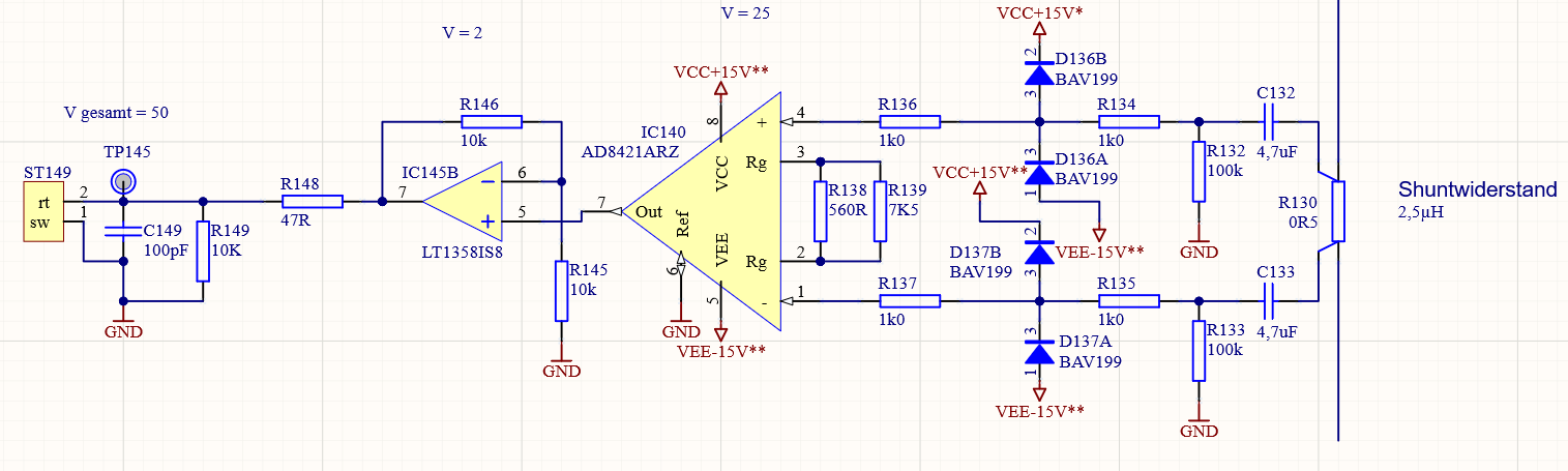 - Eine BAS70-4 ist vorgesehen. - Die Verstärkung vom AD8421 korrigiert. - der LT wird auch mit +/- 15V versorgt. Werde den Eingangsschutz des AD8421 erstmal lassen. Er hat laut Datenblatt einen recht guten Eingangsschutz. Das war auch ein Grund ihn zu nehmen. Werde trotzdem bei einer Revision die Z-Dioden Begrenzung vorsehen. Danke für die Tipps.