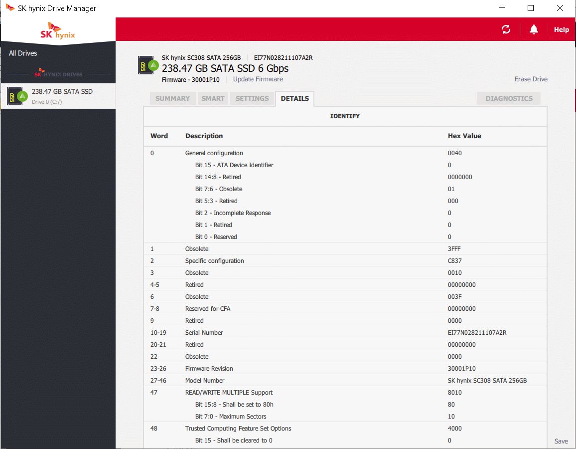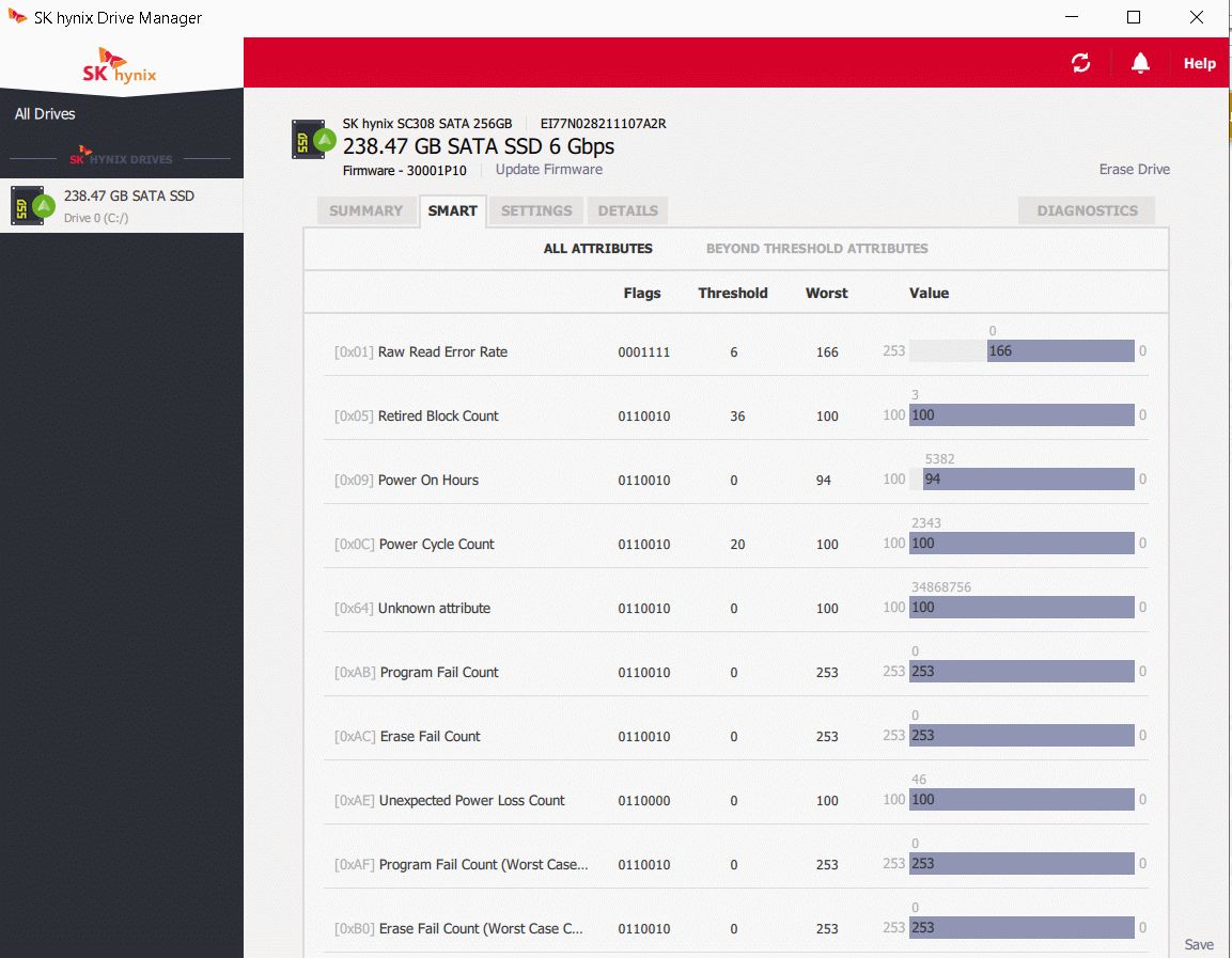 1 | D# ATTRIBUTE_NAME FLAG VALUE WORST THRESH TYPE UPDATED WHEN_FAILED RAW_VALUE |