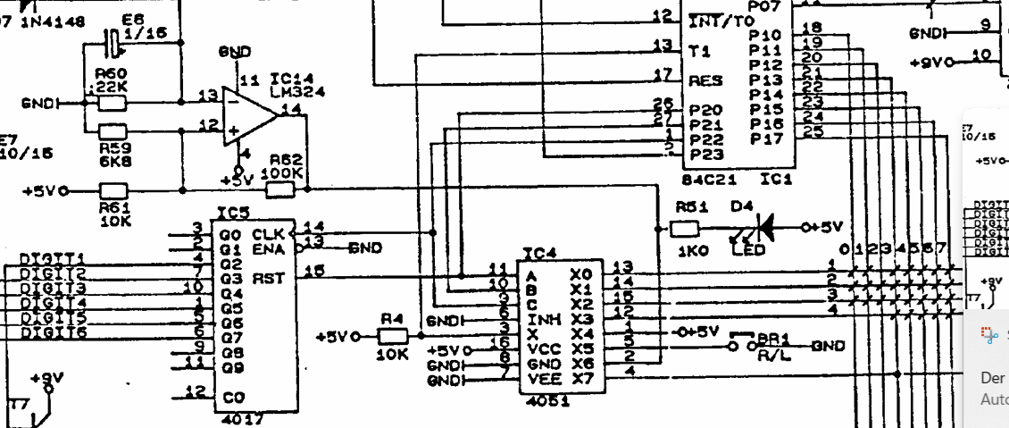 Erste Bilder vom Neuerwerb nach dem Reinigen Erstelle gerade ein erstes grobes Blockschaltbild, ist recht überschaubar gemacht der Aufbau Tasten Matrix LED Matrix Triacs über digtale Ports und ULN2803 direkt gesteuert 7- Segmentanzeigen in zwei Dreierbköcken jeweils über 7447 Dekoder Dann sind da noch 4051 Analogmultiplexer, wofür genau muss ich gleich mal gucken und ein 4017 Zeilendekoder - wird beides sicher auch für die Tasten/LED Matrix genutzt...inkl- drei Transistoren für die High-Side der LED Matrix Und eine Analogecke um das Musiksignal zu nutzen... Prozessor ist speziell gelabelt im DIP28 Gehäuse...