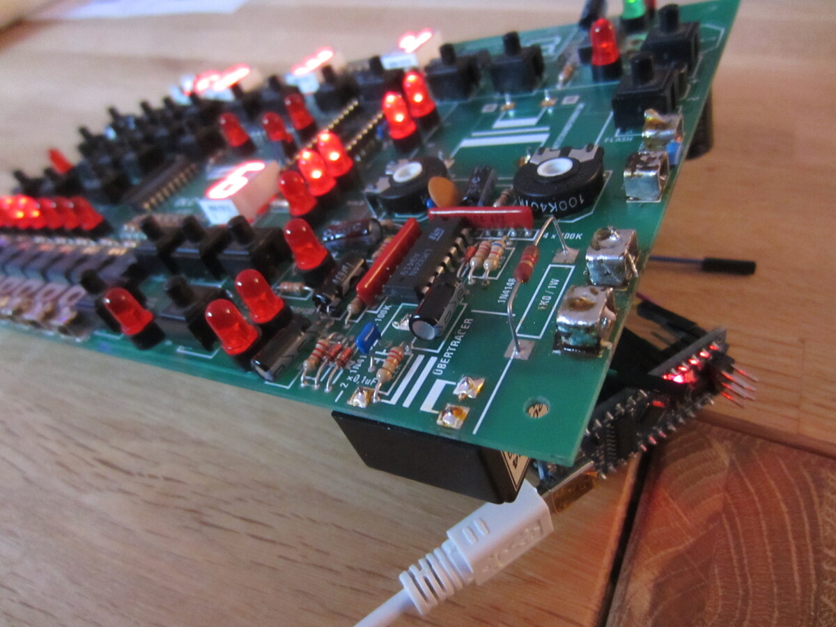 Nach einigen kleinen Anpassungen... gehts Das größte "Problem" ist und bleibt, dass für die einzelnen LED ein 0x00 auf dem Bus zur absoluten Abschaltung führt, und für die 7-Segmentanzeigen ein 0xff wie schon zuvor vermutet, befürchtet. Hilfreich wäre es gewesen einen Pin am Zähler 4017 frei zu lassen, damit man besser umschalten kann: Q0 = ungenutzt Q1 = ungenutzt Q2 = zwei Segmentanzeigen Q3 = zwei Segmentanzeigen Q4 = zwei Segmentanzeigen Q5 = acht einzelne LED Q6 = acht einzelne LED Q7 = acht einzelne LED Q8 = ungenutzt Q9 = ungenutzt Dann könnte man Q5 ansteuern, in ruhe von 0xff auf 0x00 umschalten und weiter takten... Q0 = ungenutzt Q1 = ungenutzt Q2 = zwei Segmentanzeigen Q3 = zwei Segmentanzeigen Q4 = zwei Segmentanzeigen Q5 = ungenutzt Q6 = acht einzelne LED Q7 = acht einzelne LED Q8 = acht einzelne LED Q9 = ungenutzt Momentan ist ja eh nur eine Spielerei... damals als man das Gerät im Einsatz hatte, hatte ich mir immer eine Funktion zum programmieren einer frei wählbaren Abfolge gewünscht und noch einge funktionen, kann man jetzt ja selbst alles so machen, wie einem das gefällt... :-)