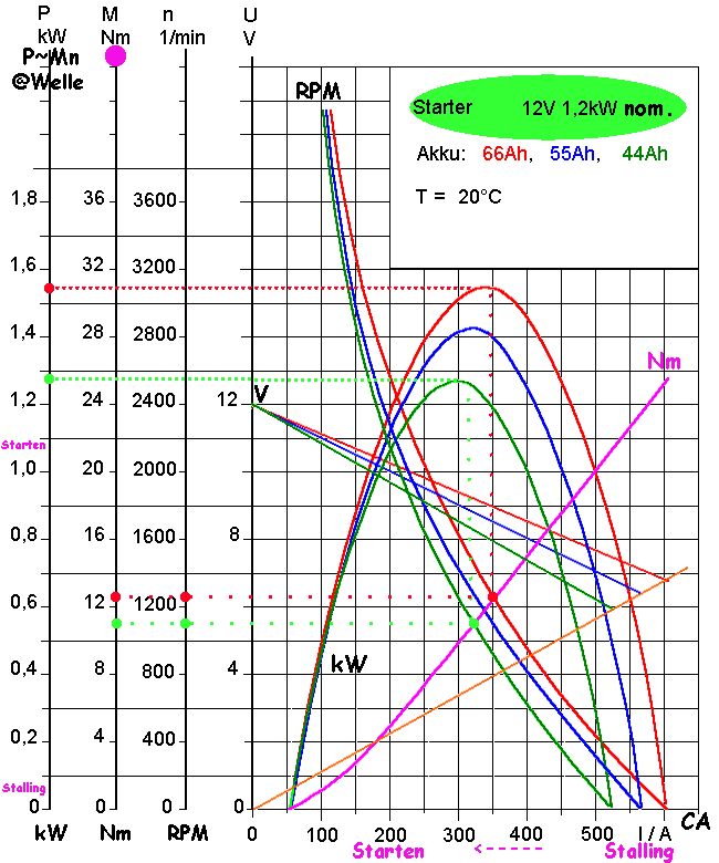 Die Glühkerzen halbwegs moderner Diesel sind alles Schnellglühkerzen, die brauchen so 10..13A pro Stück. Heißt, bei meinem Sternenkreuzer gehen die ersten 100A alleine fürs Vorglühen drauf wenns kalt ist. Dann kommt's auf das Einspritzverfahren an, wie schnell ein Diesel starten mag, bei meinem z.B. gibts keine mechanische Kopplung mehr zwischen Nocken- oder Kurbelwelle und den Einspritzdüsen. Deswegen muss der Anlasser den Motor so lange durchdrehen, bis das Steuergerät weiß wie Nocken- und Kurbelwelle stehen, bis z.B. Einspritzbeginn Zylinder 1 erreicht wird. Das sind im Extremfall zwei Umdrehungen der Kurbelwelle. Bis dahin muss die Common-Rail-Hochdruckpumpe auch genug Druck aufgebaut haben, daß damit eingespritzt werden kann.