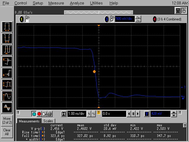 Werner H. schrieb: > Für ganz kurze Signale bzw steile Flanken kann man auch ein > 74AS00-Gatter (Advanced Schottky, evtl. mit R-C-Verzögerung vor einem > Eingang für Nadeln) verwenden. Die anderen Gatter zur > Flankenversteilerung vorschalten. 74AS ist ja sowas von flower-power-retro! Das hier ist billigstes 74LVC von TI. Ohne die R zum Fressen der Reflektionen wäre womöglich noch weniger zu erreichen. Sorry für dunkelblau auf schwarz, das sah auf dem Bildschirm besser aus. Runterladen und reinzoomen. Ich kann mich noch an den Prof im Hörsaal erinnern: "und nun, meine Dame(!) und Herren verstehen Sie, warum CMOS NIEMALS schnell werden wird!" Er lag grandios falsch. Wenn das Scope zu langsam ist, man > kann die Pulse im UKW-Radio/TV hören. Flanken sind 2-3 ns mit 3 V Peak. > > Die kürzesten Pulse bekommt man mit 50-Ohm-Vorwiderstand, einem > schnellen Schalter gegen Masse und 3-5 cm 50-Ohm-Koaxkabel (offen) in > HF-gerechtem Aufbau. Der allerschnellste Schalter ist ein > Quecksilberbenetzter Relaiskontakt (gibts immer noch außerhalb der EU). Der ist schon mechanisch viel zu groß um gegen ein CML-Gate auch nur annähernd anzustinken. Sagen wir 15 ps rise time. Gerhard H