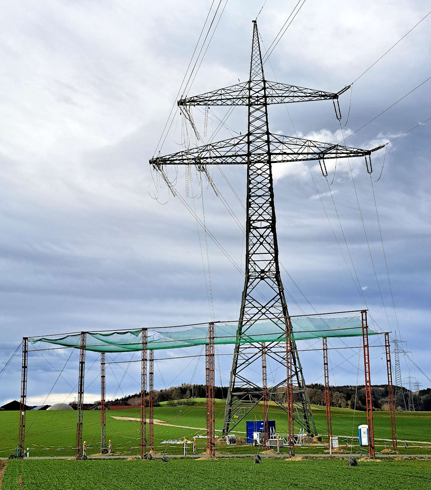 Servus, vor einigen Wochen hatte ich ja von der Errichtung einer Windkraftanlage geschrieben: Beitrag "Einblicke Windrad Flügel" . Jetzt wird in Sichtweite an der Stromtrasse gearbeitet, eventuell ein weiteres Seil gezogen. Anbei Fotos vom Mast an dem mit Leitern gearbeitet wird, vom nächsten Mast an dem statt Isolatoren Rollen hängen und dann der Grund des erst erwähnten Mast mit Materiallager.