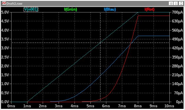 All die Trickschaltungen mit der LED-Spannung funktionieren nur deshalb sehr schlecht, weil so eine LED eben keinen "scharfen Knick" hat, sondern eine e-Funktion. Diese blaue LED lässt also auch schon bei 2,5V einen merklichen Strom durch und leuchtet deshalb sichtbar. Bei der angehängten Schaltung und einer dreifarbigen LED wäre bei 3V3 blau dominant und bei 5V würde sie rot+grün = gelb leuchten. Besser ist aber der Einsatz des OP, der wie der IRLML ja auch im SOT323 Gehäuse sitzt, also gleich viel Platz braucht, aber die LEDs definiert ansteuern kann. Ralph S. schrieb: > Hinweis: Der Spannungsregler LM317 in der Simulation wurde genommen, > weil im falstad kein universeller Regler verfügbar ist Dazu noch ein Tipp: man kann da ganz einfach eine 3V3 Spannungsquelle definieren. https://www.falstad.com/circuit/circuitjs.html?ctz=CQAgjCAMB0l3BWcMBMcUHYMGZIA4UA2ATmIxAUgoqoQFMBaMMAKABcRD8QUAWKwgkI9+UEExDZoePL2xheGSGGKRspcVOKz5vFMzzFmhRsXB4qAEzoAzAIYBXADZt2IC1RRD3vPD29UEgwwCNiE6qREhGAoeLjY4jCEmLzEqaFg2LzZzOZWto4uLGDJnN7YCChlwvyeINb2zmwMTnSW4GJUMHCsJVWyfhX9viC1PPUFTS1tHRBdsMosAE7VkpWrXsJUYPAsAO4b3kq8-lssAOarY4I12FVdyyDHkmFPkCdj2-CQF28fcH9RndOvsNnxViUHgAlCFcCGxTqjWiIkKPLh+Pi0GIiLrIOAsADKFGxmKBVVJ2xA9icAGc6GIUI8MLJToDNgylPiVgM1sMMRh7nifpceWNRcDoT4-GAMMIeTE-LjREhcaiDjzSfLZVAWNglO4AezmSd2XMeKDnthXpb3jqDjaTs92T97bbcI7CINbcKnp6kVRZX45IKfgAHX1ej1BgEJSk7b74gAexKqRnceHIaVGIhAACE6GwlgBLOgAIxpNNDdgAdtWHNXznQlgBrOi1+vnAA6NKk2AAat2APTdhB9lgw4M8cHYFkocFK5Gq6AIUEIEnK7Eqe6rzfEVNwrc6lbEOGkk9UGcnL4+8+SFm3ycPPVUW+H2+ks0-ZPxpC6ZAKSQZWzMA-ChFhv0gOdJCIZAUDMO4zBOECQAAGXHMlWUvVkF0kaBY06ZcWCAA