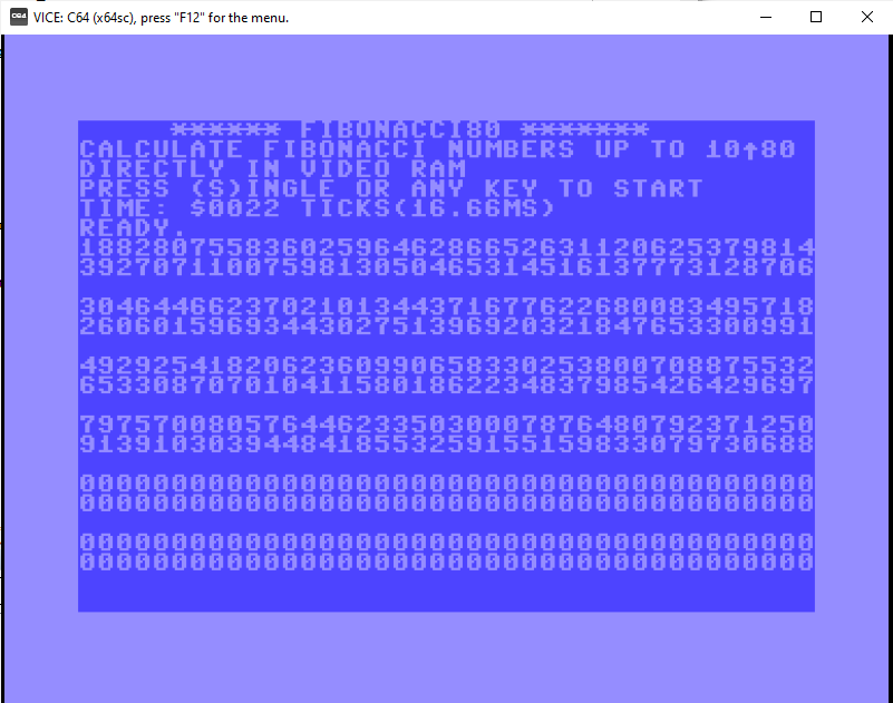 > 10^80 deshalb, weil der gute alte Commodore CBM8032 einen 80×25> Bildschirm sein Eigen nennt und man so jede Fibonacci-Zahl in einer> eigenen Zeile darstellen kann.