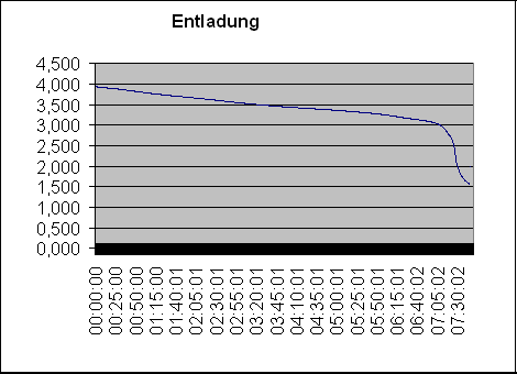 Romy K. schrieb: > Wo ist denn der Unterschied zwischen Ladeendspannung und Nennspannung? LiIon werden mit 4,2 Volt geladen, dann sind sie 100% voll. Bei der Entladung sinkt die Spannung, bis der Akku leer ist. Je nach Typ und Last sind die 4,2V relativ schnell weg und man beendet die Entladung bei 3,0 oder 2,5 Volt. Im Anhang zeige ich die Entladekurve eines beliebigen LiIon, die ich einigermaßen typisch finde. Der ist bei 3 Volt schon fast leer. Die Nennspannnung 3,6 Volt ist ein rechnerischer Mittelwert über die Entladung, mit der man den Energiegehalt abschätzt. Romy K. schrieb: > (Knopfzelle CR 2450) war letztens leer. > Lag leider 2 Jahre ungenutzt rum, das Helmchen. Ich habe aus einer über 20 Jahre gelagerten CR2450 mit 2,2 kOhm Last gemäß Herstellerdatenblatt noch 80% der Nennkapazität bekommen! Deine nur 2 Jahre sagen also, dass die Entwicklungspfuscher nicht vollständig ausschalten und Ruhestrom ziehen. Dein Akku hat deutlich weniger Kapazität (1/5) als die Primärzelle und würde schon nach wenigen Monaten durch Tiefentladung tot sein, ist auf jeden Fall eine sinnlose Idee. Unabhängig davon würde ich nicht probieren, ob die Elektronik die höhere Spannung verträgt bzw. nochmehr Ruhestrom frisst. Folge der Bedienungsanleitung, wo sicherlich steht, bei Nichtbenutzung die Batterie zu entfernen. Romy K. schrieb: > Hersteller haben wir angeschrieben. Unsinnige Aktion.
