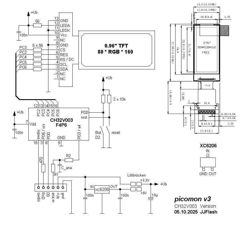 Ist schon ein halbes Jahr vergangen ? Okay, es gibt ein Update und eine Dokumentation ################################################### Vom PicoMon Terminal wurden ein paar Bugs entfernt und es gibt eine Erweiterung, allerdings nur für CH32V003. - Der Firmware wurde ein Frequenzzähler hinzugefügt - es wurde ein PCB erstellt für ein 160x80 TFT-Display Alles zusammen habe ich das in ein Archiv hier gepackt, nach wie vor beträgt die Baudrate des Terminals "nur" 4800 Bd, was für Textausgaben vollkommenausreichend ist. Der Frequenzzähler ist reziproke und funktioniert bis etwa 40 kHz (okay, das ist nicht wirklich viel, aber für die Projekte die ich machen will reicht das aus. Die Firmware hat für Verbesserungen noch viel Spielraum nach oben) Auch wenn es ein halbes Jahr her ist: Christoph M. schrieb: > und eine Oszilloskop-Funktion .. Daran werkel ich immer wieder einmal, hrmpf und möchte das auch haben. Allerdings habe ich Probleme mit einem Autotrigger. Auf der PCB habe ich einen Analogeingang nach außen geführt, der momentan noch ohne Funktion ist, zumindest eine Spannungsmessung möchte ich noch hinzufügen. Aus diesem Grund wird ein späteres analoges Signal über einen Spannungsteiler an den Pin des CH32V003 geführt. Die Funktionen Teminalprogramm und Frequenzzähler können mit der Taste auf dem PCB umgeschaltet werden. Im Archiv ist das Layout, Format Sprint Layout 6, und die Gerberfiles enthalten. Gerberfiles können so direkt zu jlcpcb.com geschickt werden. Auf der PCB sind 6 Stck. Terminals, 1 Stck. Superminiprogrammer (mit 8 pol. CH32V003J4M6) sowie eine "Arduino CH32V003 Nano - Platine" mit seriellem Bootloader enthalten (werde ich in der Dokumentation getrennt aufarbeiten) ################################################### Grundsätzlich bin ich von dem kleinen Dingelchen namens TFT-Display mit 160x80 Pixel fasziniert, auch was den Preis angeht. Vom Preis her noch mehr fasziniert bin ich über den Spannungsregler XC6206. Preise Stand 05.10.2025 Display: 1,37 € https://www.lcsc.com/product-detail/C18198246.html Spannungsregler: 1,05 cent https://www.lcsc.com/product-detail/C5252899.html