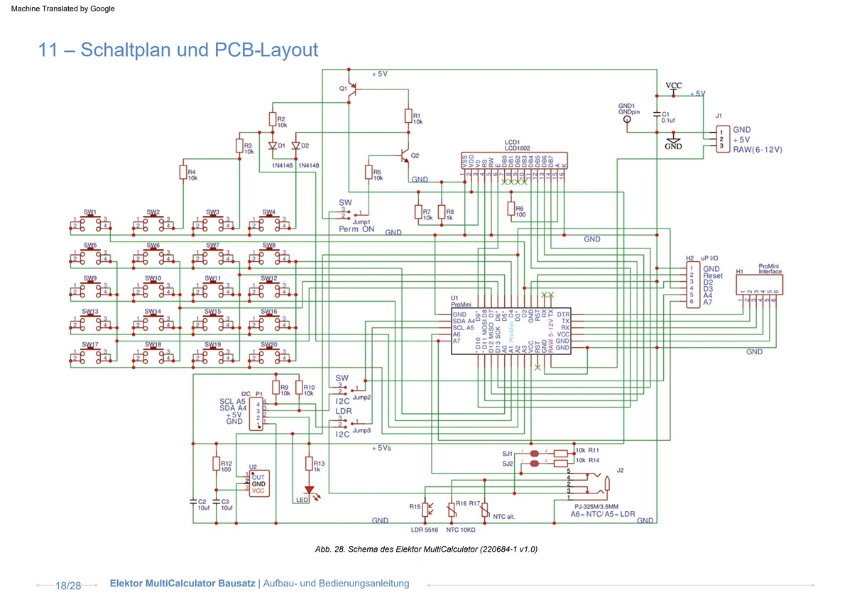 Update: Wurzel geht doch, allerdings mit einem Trick. Zunächst hatten wir einfach z.B. eine 2 eingetippt und dann die Wurzeltaste, es passiert nichts (umgekehrt auch nicht). Später haben wir (die Enkel!) mitbekommen, dass die Wurzel nur aus der 2. Zeile, also dem Ergebnis gezogen wird. Also tippt man 1x2= ein, steht die Zwei im Ergebnis, Wurzeltaste sagt dann 1,414. Naja, wollen sie das ändern, müssen sie tiefer in Arduino einsteigen. Hier noch die derzeit möglichen Funktionen: Modes of operation (software v1.1, ich habe aber V1.3 eingespielt, Bugs behoben) 1 – Calculator 2 – 4 Ring Resistor Code 3 – 5 Ring Resistor Code 4 – Decimal to Hexadecimal and Character (ASCII) conversion 5 – Hexadecimal to Decimal and Character (ASCII) conversion 6 – Decimal to Binary and Character (ASCII) conversion 7 – Binary to Decimal and Hexadecimal conversion 8 – Hz, nF, reactance Xc calculation 9 – Hz, µH, reactance Xl calculation 10 – Resistance calculation of two resistors connected in parallel 11 – Resistance calculation of two resistors connected in series 12 – Calculation unknown parallel resistor 13 – Temperature measurement 14 – Differential temperature measurement T1&T2 and Delta (δ) 15 – Light measurement 16 – Stopwatch with lap time function 17 – Item counter 18 – Display IR NEC code from a remote control 19 – AWG conversion (American Wire Gauge) 20 – Rolling Dice 21 – Personalize startup message 22 – Temperature calibration Zum Experimentieren erstmal ein guter Anfang, mal sehen was die Enkel da noch hinbringen. Old-Papa