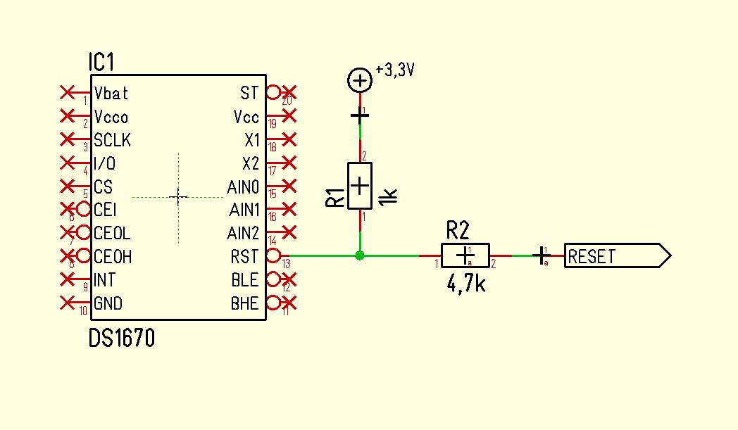 Die einfache RC Kombination geht leider nicht, Reset verschleift immer mehr. Ich bräuchte einen Transistor parallel zum Reset welcher das Singnal nach dem Einschalten ein paar huntert ms auf Low zieht und so den Pushbutton simuliert. Oder einen neuen DS1670, kostet bei Mouser allerdings über 12€. Woran könnte der 1670 denn gestorben sein? Nicht das der 1k PullUp zu klein ist. Intern ist laut Datenblatt ein 47k verbaut. Nachtrag: Es gibt einfache Resetcontroller im SOT23-3 Gehäuse für wenige Cent, so einen werde ich dem DS1670 parallel schalten. Das sollte funktionieren. https://www.st.com/resource/en/datasheet/stm1001.pdf