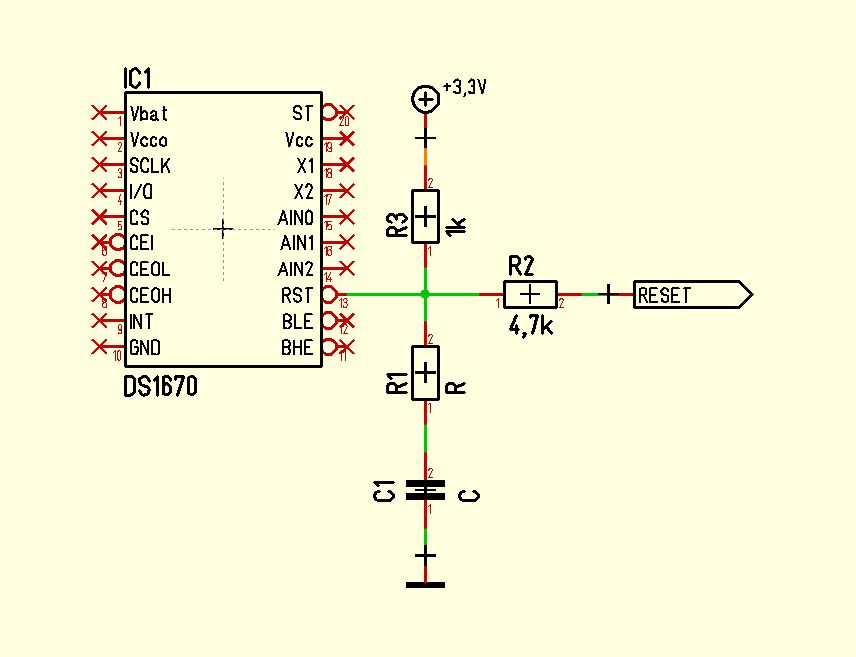 Hallo Dieter, du liegst mit deiner Annahme absolut richtig, es ist ein DS1670. Ich hatte den ehrlich gesagt auch schon im Verdacht, konnte aber keine Verbindung zum RESET des Prozessors finden. Nach deiner Vermutung hab ich jetzt noch mal genauer nachgeschaut und jede Leiterbahn neben dem DS1670 durchgepiepst. Tatsächlich gibt es eine Verbindung, Schaltplan im Anhang. Anbei das Signal nach einschalten direkt am RST Ausgang des DS1670. Gelb 3,3V, Grün RST. Bedeutet das nun das der DS1670 defekt ist oder wo könnte ich noch weiter suchen? Falls Du Interesse hast, ich habe von der Vor- und Rückseite der Platine hochauflösende Fotos die ich auch schon entzerrt und skaliert habe, so das man sie direkt übereinander legen und die Signalwege halbwegs verfolgen kann.