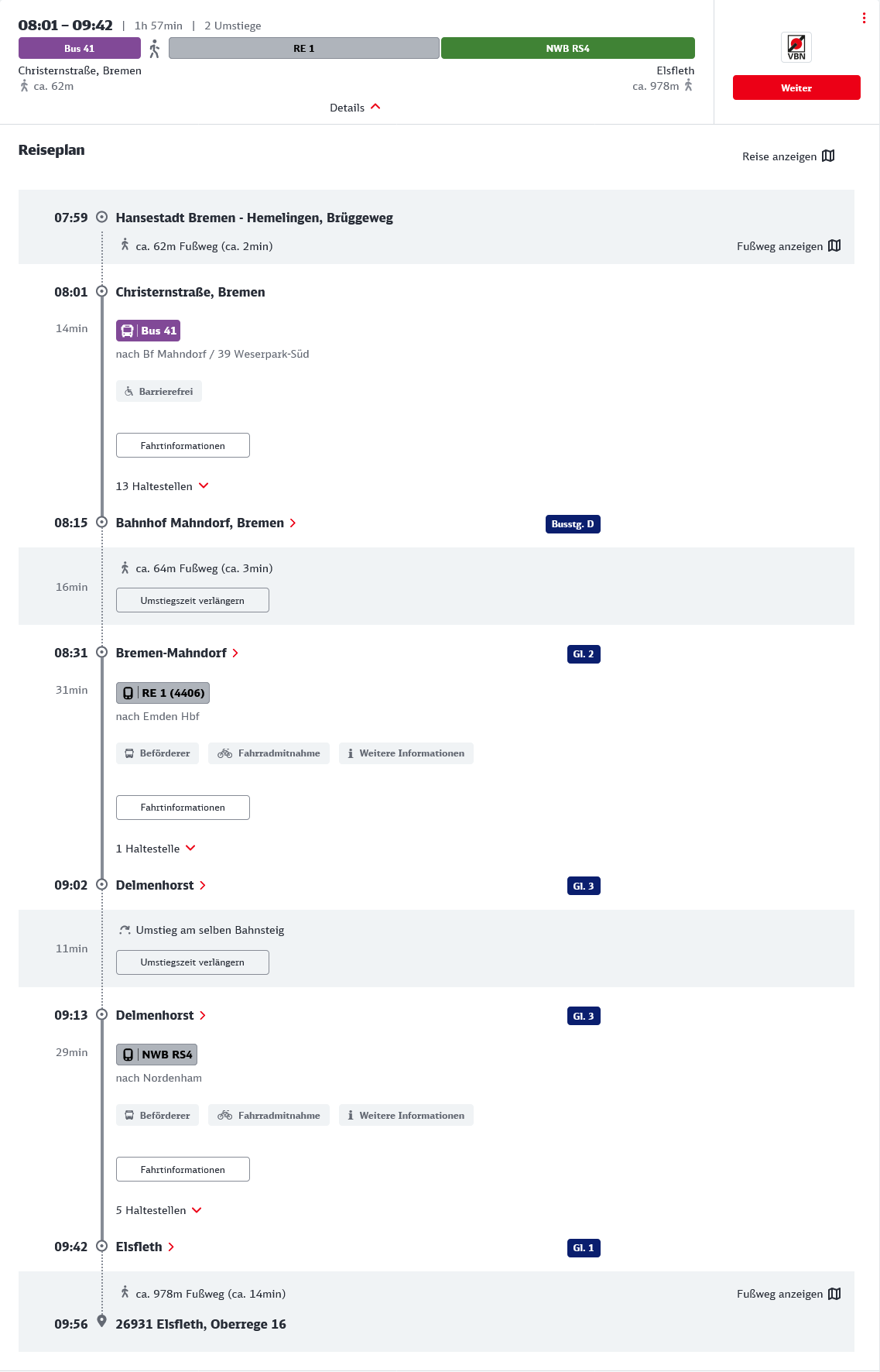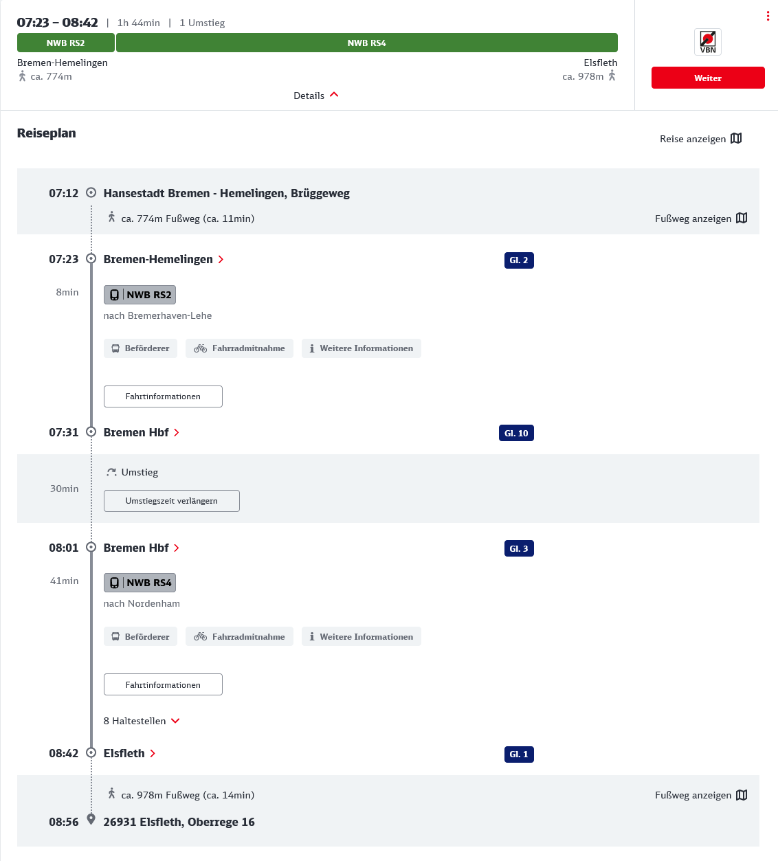 So, jetzt habe ich mir mal spaßeshalber einen Reiseplan für Elsfleth erstellen lassen. Mit der Bahn brauche ich mindestens 1:45h bis 2 Stunden. Davon knapp 1 km Fußweg, davon einmal mit dem 40kg-Bootsanker zurück. Mit dem Auto sind es ca. 50 Minuten laut Google Maps. Die Erfahrung der letzten Jahre sagt: Eher schneller.