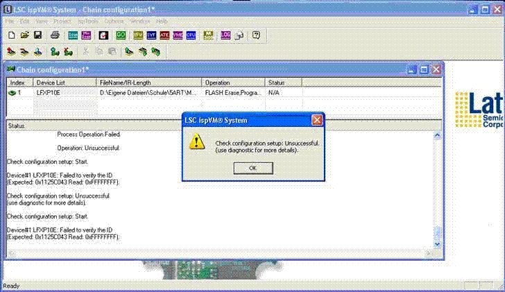 Danke Leute! Das nächste mal von mir aus in JPG, GIF oder sonst was.... Leider haben wir das schon alles überprüft!! Angeschlossen ist das Bord über USB mittels eines Lattice eigenen Konverter. Dass das Board angeschlossen ist wird ja auch erkannt, nur die ID kann nicht gelesen werden. Danke Viktor PS.: Ich hoff jetzt ist für jeden was dabei