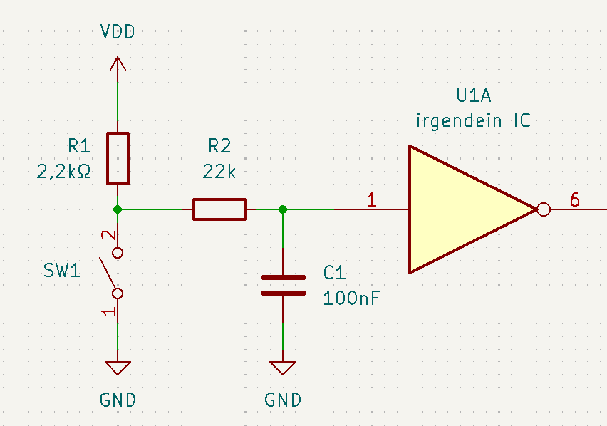 Alexander H. schrieb: > Wie wäre die ideale Kombination für gute Störsicherheit (mit C)? Ich kann dir keine ideale Empfehlung geben. Das hängt von vielen mir unbekannten Faktoren ab, und selbst wenn ich sie wüsste, habe ich keine Ahnung, wie man es berechnet. Ich würde einfach ein Oszilloskop mit 1:10 Teiler an den Eingangspin hängen und schauen, wie er auf diverse Störungen in direkter Nähe reagiert. > Wie genau wird der C am Eingang verschaltet? Eine mir vertraute Möglichkeit ist die angehängt. R1 soll mehr als 1 mA durch den Schaltkontakt fließen lassen, damit er langfristig zuverlässig funktioniert (Wetting Current). Je nach Schalter kann mehr Strom nötig sein. R2 beschützt den Mikrochip weitgehend vor Fremdspannung. R2 + C1 bilden einen Tiefpass, der eventuell eingekoppelte Funkstörungen/Radiowellen abblockt. Die Grenzfrequenz ist grob geschätzt F = 1/(R·C) also in diesem Fall 450 Hz. Normale Schaltvorgänge sind viel langsamer, diese lässt der Filter durch.