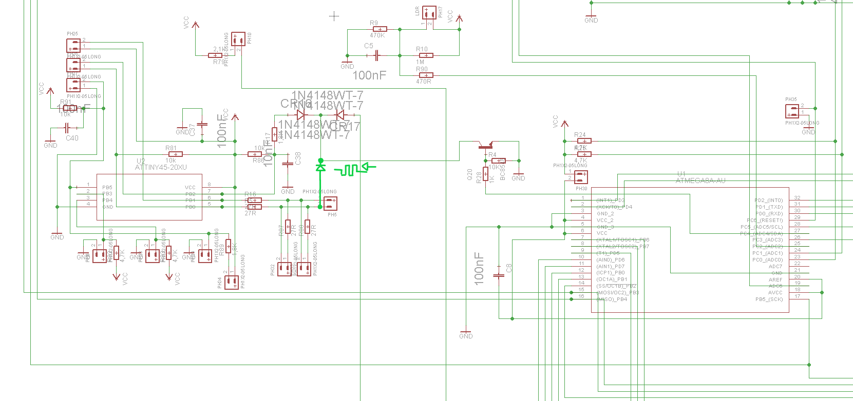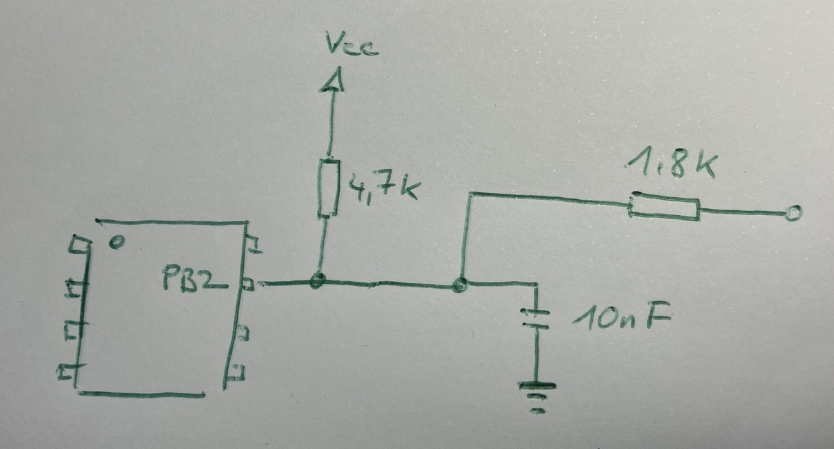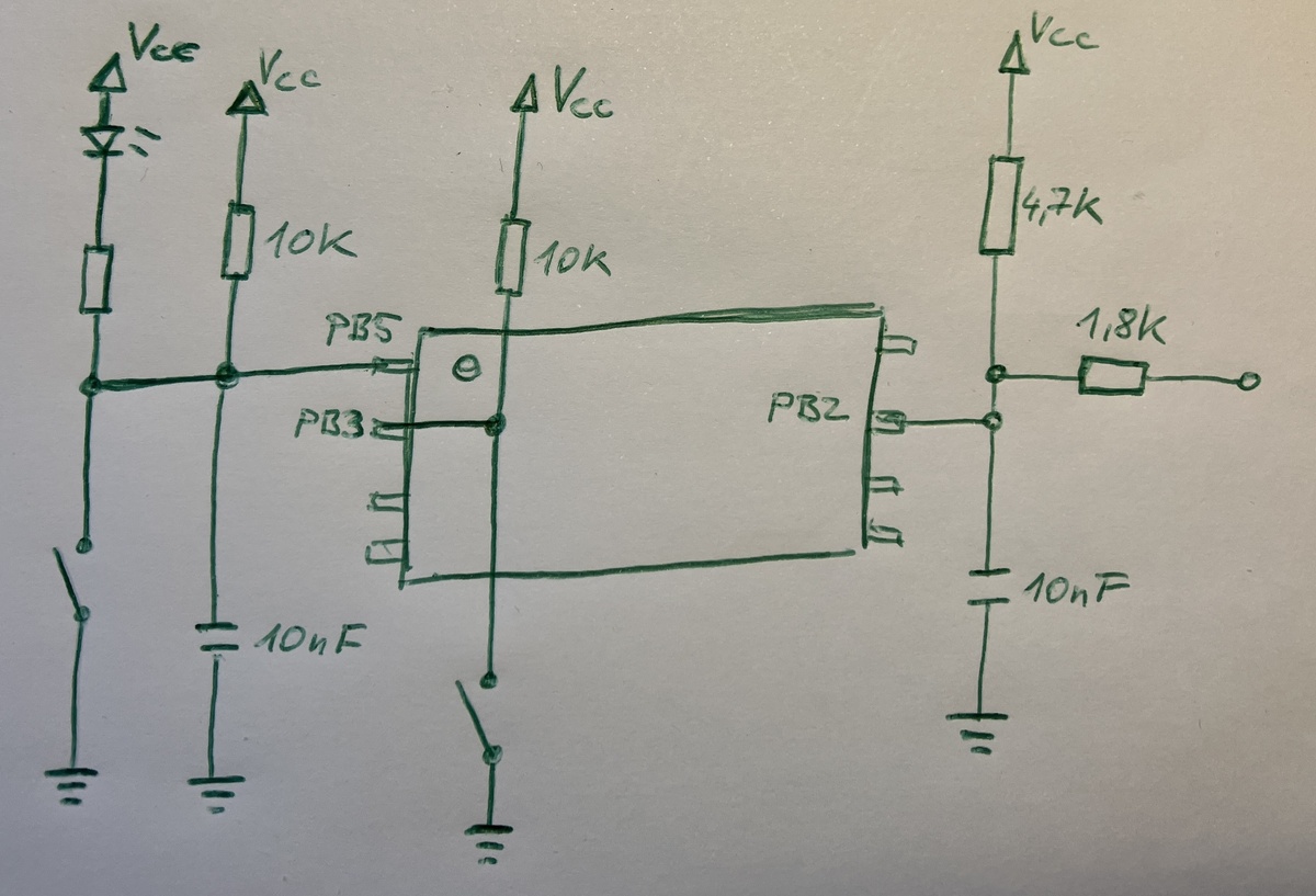 Ich hab nochmal nachgeschaut und es darf wohl maximal 1mA über die Schutzdioden an den I/Os fließen, also ist es sicherer darauf zu verzichten. Die Uhr (https://radiokot.ru/circuit/digital/home/215/) hat in der neuesten Firmware u.A. einen 1,9KHz Tastenton (zuschaltbar) bekommen. Bei Tastendruck wird ein kurzer 1,9kHz Beep ausgegeben, bei Alarm wird ein 1,9KHz Rechtecksignal im 2Hz Takt ausgegeben. Wäre es möglich, beide Töne, Alarm und Tastenton auf dem gleichen Lautsprecher auszugeben? Meine Überlegung: Damit zwischen Tastenton und Alarm unterschieden werden kann, wollte ich zuerst ein Delay von 10s einsetzen. Nach Überschreiten der 10s sollte der Alarmton ertönen, solange die Pulse an PB2 unter 10s bleiben, sollte der Tastenton aktiv sein. Der Ansatz ist aber nicht praktisch, wenn man mal länger als 10s im Menü ist und es verändert die Abstände der Alarmtöne. Die Lautstärke bei Tastendruck geht gerade so (mit Schottkydiode). Gibt es eine Möglichkeit, per Software die regelmäßigen 2Hz Pulse (im Alarmfall) zu detektieren und somit den Ton bei Tastendruck vom 2Hz-Alarmton zu unterscheiden? Oder könnte man das doch an PB2 per RC-Glied filtern? Folgendes hab ich probiert (Anhang). Buzzer= PH5 (parallel zum Buzzer hängen noch zwei LEDs). Der Tastenton funktioniert (während der 5s), also solange PB0 auf high gehalten wird(es fließen 36mA und damit wird der Attiny überlastet). Wahrscheinlich ist das Ganze viel zu kompliziert gedacht?!:)