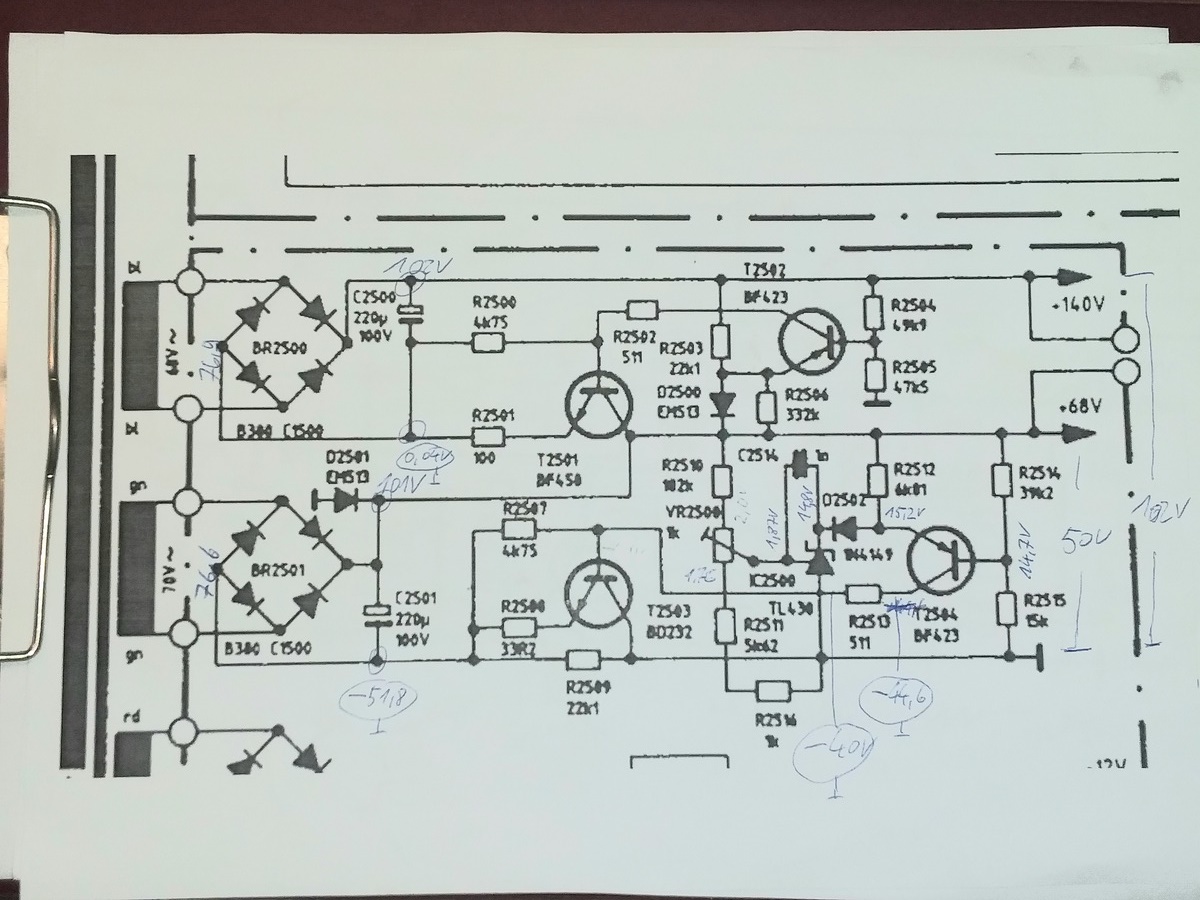 Mal ein nicht unwesentlicher Hinweis: - es fällt auf das die 68V Soannung auch als Referenz für die 140V Spannung dient. - es genügt als sich als erstes auf die 68V zu konzentieren mit der Fehlersuche. - wenn dort der Fehler gefunden ist, werden auch die 140V wieder erreicht. Bevor man also weiter nur ohne Verständnis der Regelschaltung in der Schaltung rummisst.
