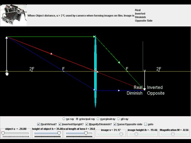 Die Vergrößerung ist einstellbar anhand der Linsengleichung, https://de.wikipedia.org/wiki/Linsengleichung. Eine andere Vergrößerung passiert im Wechsel von der Bildsensorfläche zur Bildschirmfläche. Die Vergrößerung im Mikroskop passiert durch die Multiplikation von Objektivvergrößerung mal der Okularvergrößerung zb 50x*10x=500x. Die Brennweite einer Lupe berechnet sich mit dem normalen Sehabstand (Leseabstand) = 250mm = Brennweite * Vergrößerung. ZB eine 3x Lupe hat eine Brennweite von 83,3mmm. So ähnlich ist es auch bei Mikroskop-objektiven. Ein 20x Objektiv hat eine Brennweite von 12,5mm. Das heißt also die 20x-Linse hat einen Arbeitsabstand von 12,5mm vor der Linse wenn sie auf das ins Unendliche fokussierte Auge projiziert. Oder aber, ein weit entferntes Objekt bildet im Abstand der Brennweite auf eine (Wand-)Fläche ab. So wird die Brennweite von Lupen,Kamera,Brillen, ...-linsen bestimmt. Wie man aber sieht ist die Vergrößerung von den Abständen vor und hinter der Linse abhängig. Ein gutes Objektiv ist für einen bestimmten Arbeitsabstand konstruiert, gerechnet und bringt nur dann das beste Bild. Die Auflösung (Linien pro mm) ist von dem Öffnungswinkel (Apertur) der Linse abhängig, der Winkel des Objekt-lichtes der abweichend von der Achse noch vom Rand der Linse akzeptiert wird. Heißt, je näher das Objekt vor der breiten Linse ist, desto besser kann das Detail gesehen werden, oder die Linse muß recht groß sein oder gar vorne konkav. Hat der Bildsensor nicht genug Pixel kann er die Auflösung nicht wiedergeben (Nyquist-theorem). Gute Auflösung geben meist 10x Objektive in der Mikroskopie. Die Kamerasensoren von Webcams sind oft so konstruiert, daß die Ränder einen schrägen Einfallwinkel erwarten, da kann man nicht gut mit experimentieren, fürchterliches Bild. in einem Fernglas wird durch Prismen die hintere Bildweite(abstand) gefaltet. Die Fernglasfrontlinsen brauchen aber nachträgliche Korrektur der dazugehörigen Okularlinsen. Diaprojektive (80-150mm) sind auskorrigiert, Scannerlinsen (50mm 1:1) auch, Kameralinsen natürlich, Brillenlinsen möglicherweise, Fotovergrößerungsobjektive, Tageslichtprojektorlinse (300mm) auskorrigiert. Gehen wir von einer Dialinse(100mm)(2,5x) in Retrostellung aus. in 200mm Arbeitsabstand erhält man im Bildabstand (Sensor) von 200mm eine 1:1 Abbildung, keine Vergrößerung. Bei Arbeitsabstand 100mm (kürzer geht nicht) erhält man im Unendlichen eine unendliche Vergrößerung. Bei Arbeitsabstand 110mm erhält man erst in 1100mm ein Bild mit 10x Vergrößerung. Bei 150mm Arbeitsabstand erhält man in 300mm eine 2x Vergrößerung. Mit einer üblichen 50mm Fotolinse in retro erhält man in 100mm Arbeitsabstand in 100mm ein 1:1 Bild, größerer Arbeitsabstand würde verkleinern. Das Problem ist, daß man nur im Abstand 1bis2*Brennweite eine Vergrößerung erhält und, daß dabei die Kamera in großem Abstand von der linse steht, es also ein sehr langer Aufbau wird. Das andere Problem ist die Auflösung, sie erfordert große Linsenöffnung, das wird teuerer. Welchen Arbeitsabstand willst Du denn, und welche Vergrößerung soll es sein ? ps: wenn man die .gif-datei als gif herunterlädt, so kann man die bewegte handlung im bild gucken, das .jpg macht das nicht.
