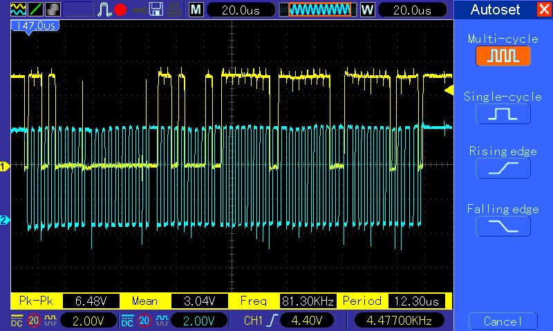 Die Signalpegel sind gut. Zur weiteren Analyse wäre jetzt ein Logic-Analyzer hilfreich. Darf gerne auch ein 8 € Teil aus China sein.