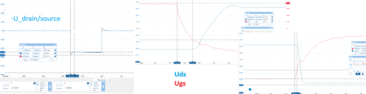 Bei U_GS fällt das kleine Zucken nach unten bei der steigenden Flanke auf. Das könnte darauf hindeuten, dass die Sperrschichtkapazität einen Schwingkreis bildet. Genau dagegen würde eine Ferritperle am Gate helfen. Würth hat einen guten Service, vielleicht kann ein FAE von denen auch weiterhelfen und Muster bekommt man da auch sehr gut.