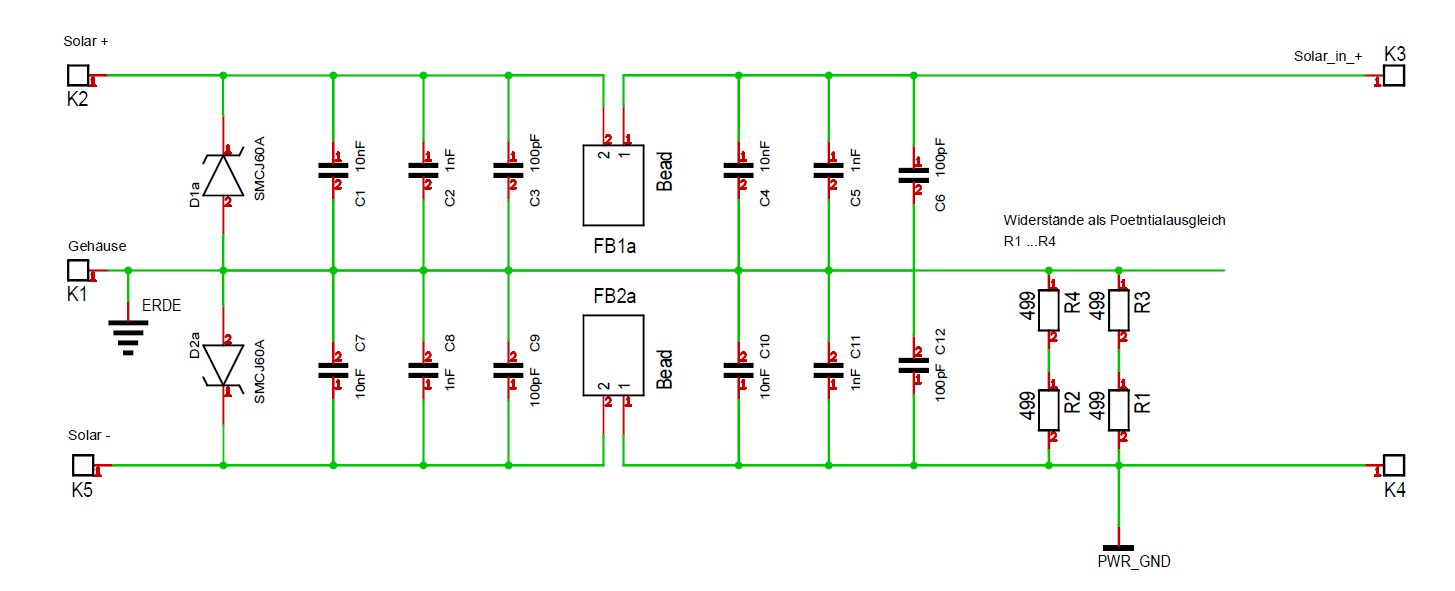 Klaus R. schrieb: > Ich würde zunächst einen Bead wählen der etwas unterhalb von 200 MHz das > Maximum hat. Dann muß man sich Kerkos mit passenden Resonanzfrequenzen > aussuchen. Die sollen parallelgeschaltet nacheinnander möglichst für > eine gute Dämpfung des Bereich sorgen. Mit drei Kerkos kann man schon 10 > MHz bis 100 Mhz gut abdecken. ich überlege, die Störungen eingangsseitig auf Erde abzuleiten. Als Bead verwende ich -wie oben erwähnt- den 710-74279392 von W-E. Blitz- bzw. Überspannungsschutz da Solarversorgung vom Dach. Ich habe nun einen Ansprechpartner bei Würth und werde nächste Woche nachhacken. Die Werte der Kapazitäten stehen noch nicht fest. Gerne lese ich eure Kommentare zum Filter im Anhang..