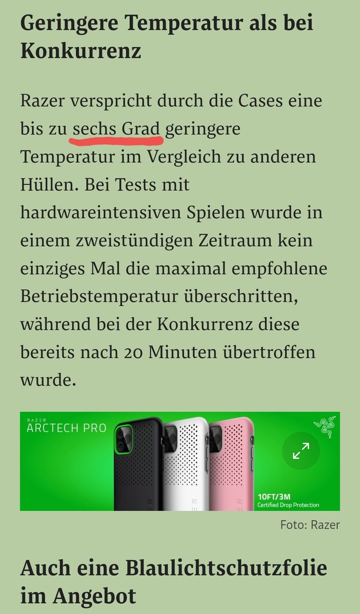 Marcel V. schrieb: > Ich finde die Bedienungsanleitung gerade nicht, aber es gibt auch noch > andere Hersteller, die das Gleiche versprechen. Selbst wenn das > Smartphone statt den versprochenen 6°C nur um 3°C gekühlt würde, dann > ist das immer noch besser als nix! Das Smartphone wird nicht gekühlt. Es soll sich angeblich um bis zu 6°C weniger erhitzen als bei anderen Hüllen. Also Z.B. ganz ohne Hülle 35°C, mit "anderer" Hülle 52°C, mit Deiner Hülle 46°C.