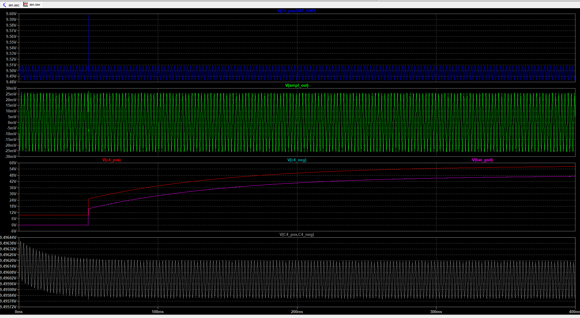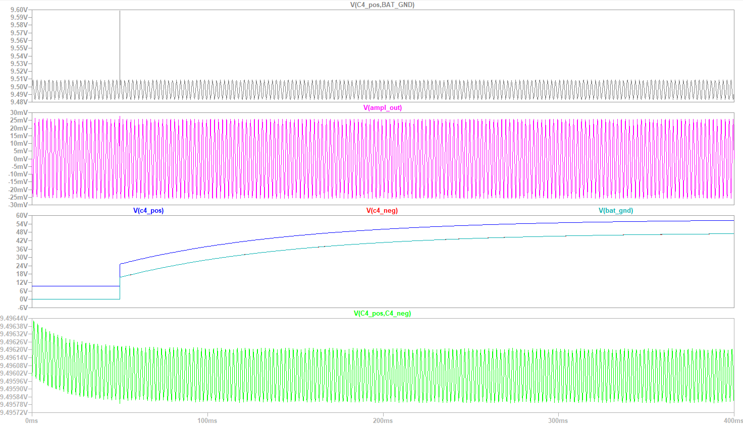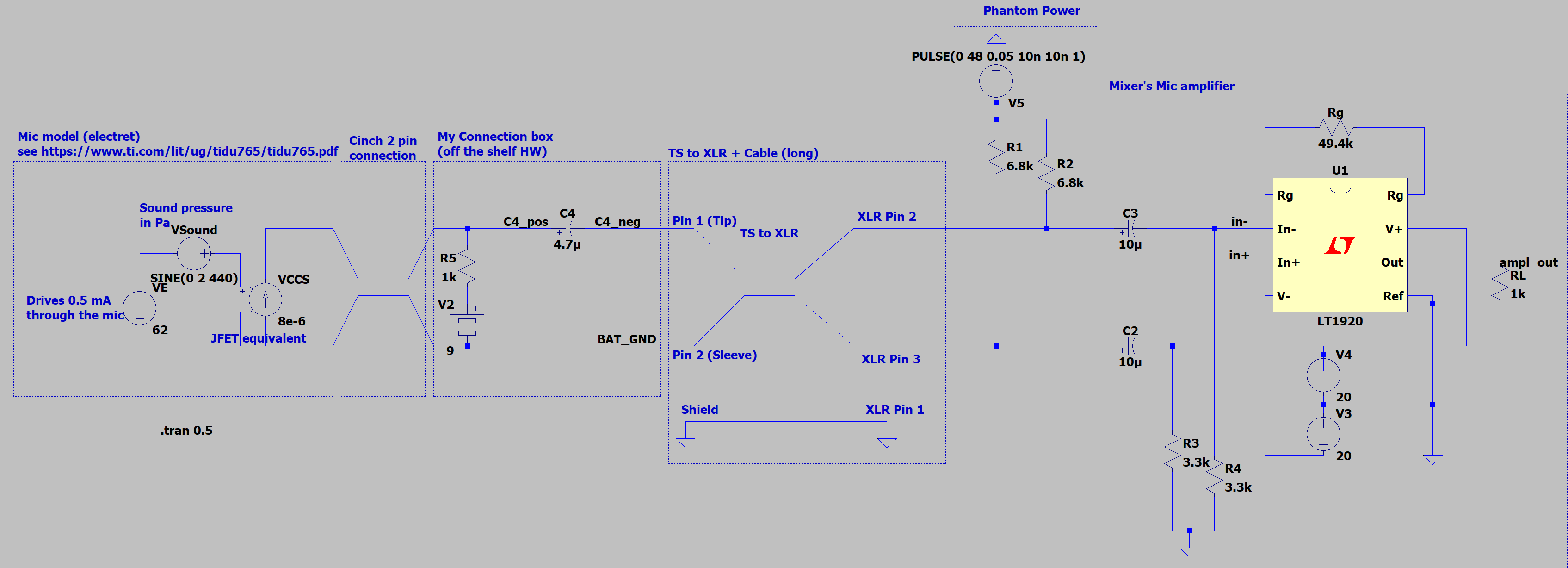 Okay okay, dann also nochmal von vorne, siehe angehängte Schaltung - das ist im Kern was ich oben darstellen wollte, aber nicht getan habe. Die Schaltung stellt eine kleine Mikrofon Kapsel dar (links), das Model ist nach https://www.ti.com/lit/ug/tidu765/tidu765.pdf. Dann gibt's eine über ein kurzes Kabel mit Cinch Anschluss die "Connection Box", die nur eine 9V Batterie, einen bias Widerstand R5, und C4 als AC Kopplung beinhaltet. Von da geht's via 2 pin TS ("Klinke") Stecker per Adapter auf einen 3 pin XLR Stecker (Pinbelegung wie gezeigt, XLR GND nicht an die Box angeschlossen!). Dann kommt ein längeres 3 adriges Kabel, das dann in das Mischpult geht, das die Phantomspannung und einen mic Verstärker beinhaltet. Nachgebaut wurde das nach https://www.ti.com/lit/an/sboa320a/sboa320a.pdf?ts=1758132716182 Seite 2. Der gewählte Verstärker ist dieser: https://www.analog.com/media/en/technical-documentation/data-sheets/1920f.pdf Der Hintergrund meiner Frage ist, ob die aufgeschaltete Phantomspannung den gepolten Elko C4 in irgendeiner Art schädigen kann, und daher kam die Frage im ersten Post auf. Die Simulation (via LTSpice 24.9, die natürlich falsch sein kann - Feedback gerne erwünscht) zeigt in der Tat keine hohen Spannungen an C4, siehe angehängte Bilder. Stattdessen wird der DC Pegel von bat_gnd, C4_neg und C4_pos gleichmäßig angehoben, sodass die Spannung über C4 stets nur die 9 V Bias + eine kleine Wechselspannung ist. Die ~25 mV peak-peak des "Mikrofons" werden - egal ob Phantomspeisung an oder aus ist - die ganze Zeit um einen Faktor von -2 (weil ich +/- inputs vertauscht habe) verstärkt, wie gewünscht. Fragen: - Entspricht diese Sim (ausreichend) der Realität? D.h., kann ich in meiner echten Schaltung bedenkenlos Phantomspeisung anmachen, ohne dass meine (teuren) Mikrofone oder deren Beschaltung zerstöre? - Kann ich theoretisch beliebig viel Phantomspannung überlagern, ohne dass C4 die Grätsche macht, oder kann der bat_gnd Pegel irgendwann nicht mehr "mithalten"? - Was ist denn jetzt das schlechte für den Kondensator? Die Spannung, die darüber abfällt? Muss diese korrekt gepolt und eine Amplitude in den specs haben (DC natürlich)? - Ich verstehe nicht, warum c4_pos, c4_neg sowie bat_gnd den DC Pegel gleichzeitig erhöhen; oder besser warum C4_neg auf bat_gnd liegt. Ich denke ihr habt mir schon versucht zu erklären aber ich habs noch nicht gerallt. Was ist Ursache, was ist Wirkung? - was ist mit dem Peak bei Einschalten der Phantomspannung, kann der duechschlagen und zu Spannungsüberhöhung führen? C4 Ist ja immerhin für einen kurzen Zeitpunkt wärend des Sprungs durchlässig. Vielen Dank!
