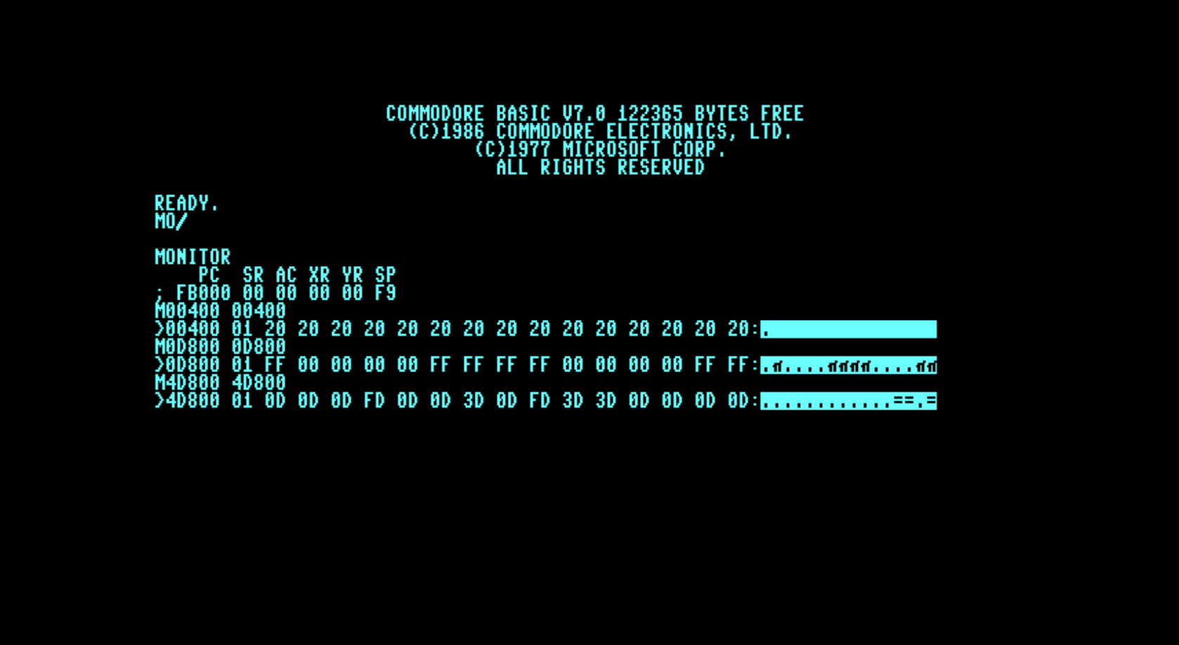 Ich trau mich schon gar nicht diese Frage zu stellen. Ich habe dieses Programm eingegeben um mal Farb- und Video RAM zu testen. Das Programm ist aus einem Data Becker Buch. Nur funktioniert das nicht so richtig am c126. Als Startadresse habe ich es einmal mit $c000 probiert das wird der Zeichensatz nur teilweise dargestellt und nicht in weiß und einmal im Bereich $1300 da passiert gar nichts. Das Programm aber funktioniert im C64 so wie es soll, weiße Schrift mit Kompletten Zeichensatz. Grafic Mode 0 beim C128.