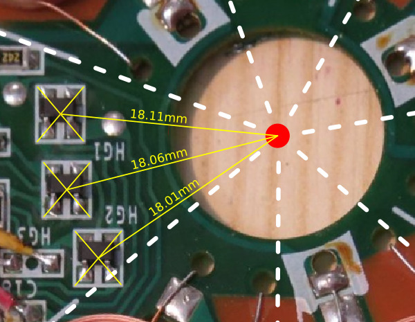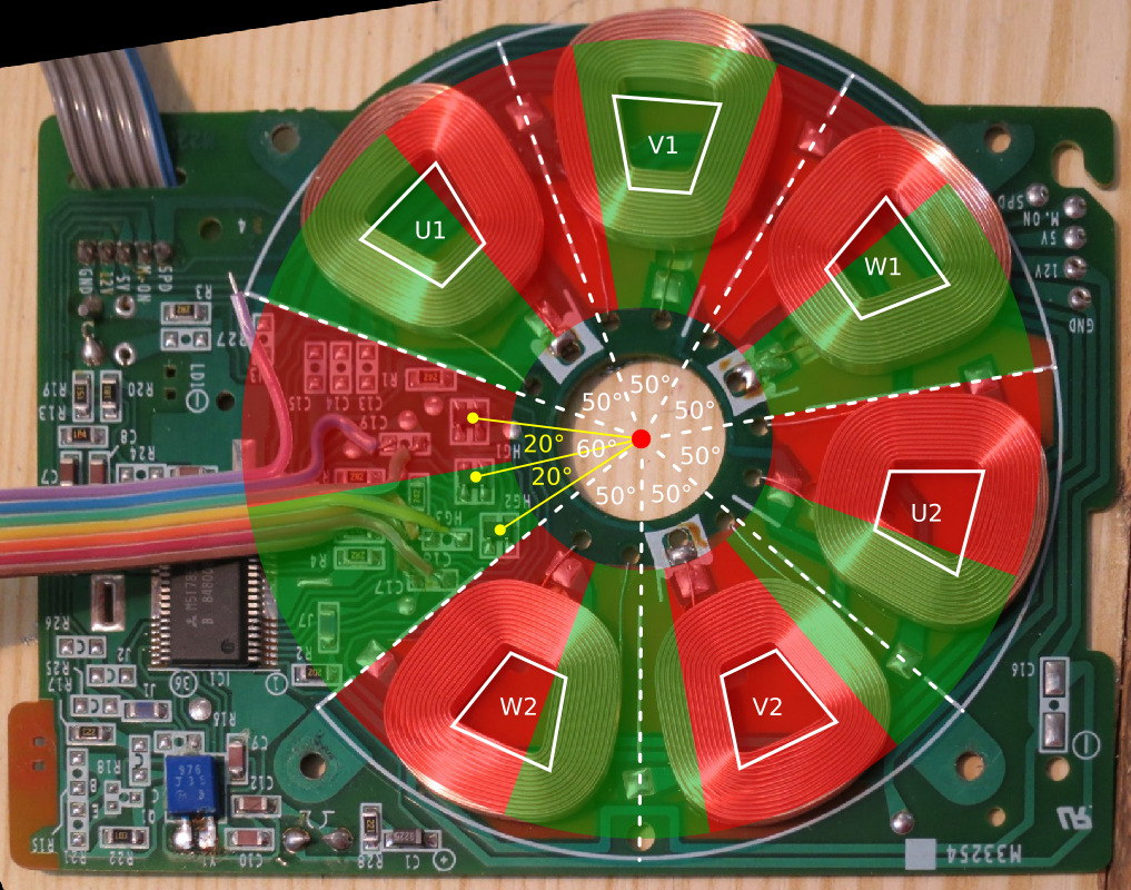 Hab mal dem Ursprungsartikel nachgegraben, findet sich dort: https://martin-jones.com/page/5/ Sehr weit unten, unter der Überschrift: "Repairing a floppy disc drive". Text dabei ist u.a. "The motor is controlled by a Mitsubishi M51785P motor controller chip. The chip’s data sheet revealed that the motor has three phases, each of which has a coil to drive the rotor round and a hall effect sensor for feedback. This particular one is arranged with two coils per phase, but occupying 6/7 of a revolution, so the motor goes more slowly than the chip is driving it. ... Here’s a closeup of the circuit board. You can see the six coils, and the coloured wires I soldered on to measure things while the motor was running." Bei der Anordnung der Hall-Sensoren irritiert das sie nicht im gleichen Abstabd zur Drehachse montiert ist. Wenn der Rotor als Anordnung von Stabmagneten auf einer einer Kreislinie verstanden wird, ist der Punkt der höchsten Feldstärke direkt unter dieser Kreislinie.
