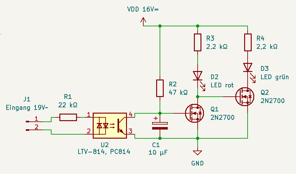 Reiner schrieb: > Eingangsspannung 19V AC. Möchte über einen Optokoppler (galvanische > Trennung und möglichst wenig Stromverbrauch!) 2 LED's schalten. Die > Spannung dort ist 16V DC.
