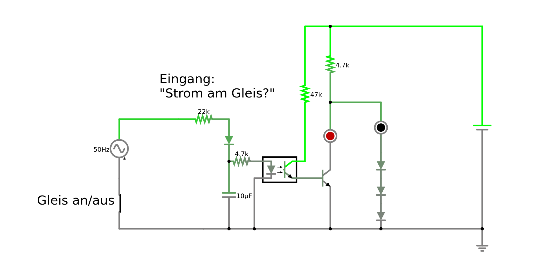 Hallo zusammen, bin jetzt von der Hochzeit zurück, daher die habe ich mich noch nicht gemeldet. Nun mal zu einigen Klarstellung: Mit der CS3 schalte ich über den M84-Decoder (schaltet über potentialfreie Relais) den Bahnstrom ein und aus -> siehe auch das angepasste Bild mit Kontakt S1). Daher liegt in dem AC-Eingangsabschnitt auch keine Spannung an. Dann soll die rote LED leuchten. Wenn der Kontakt geschlossen ist, liegt der Bahnstrom wieder am Gleis und die grüne LED soll leuchten. Dass die Lok+Waggons in der stromlosen Phase nicht mehr ansprechbar sind, ist mir egal. Stelle nochmal die Frage an nemopuk: Funktioniert der Optokoppler so, dass er wenn der Schalter S1 geschlossen ist, dauernd auf der DC-Seite zwischen rot und grün umschaltet? Das würde dann nicht passen, ansonsten müsst ich eine Gleichrichter vorschalten? Gruß Reiner
