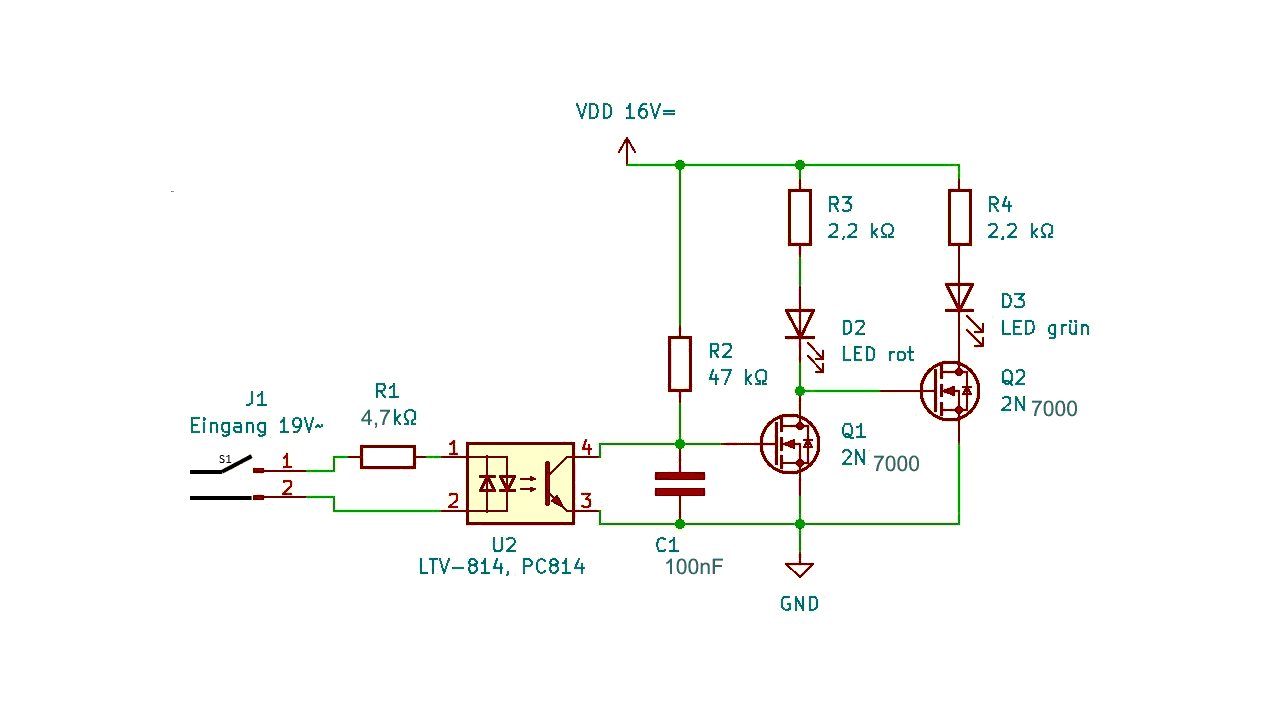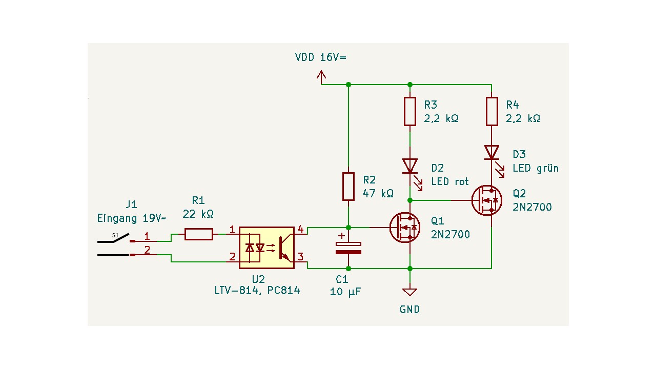 Hi zusammen, bin hier neu und in Analogtechnik nicht sehr bewandert. Hab folgende Anforderung: Eingangsspannung 19V AC. Möchte über einen Optokoppler (galvanische Trennung und möglichst wenig Stromverbrauch!) 2 LED's schalten. Die Spannung dort ist 16V DC. Ablauf: Liegt die Eingangsspannung an, dann soll die grüne LED leuchten, liegt keine Eingangsspannung an soll die rote LED leuchten. Für Profis sicher eine Kleinigkeit, für mich leider nicht Hat jemand ne Idee? Gruß Reiner