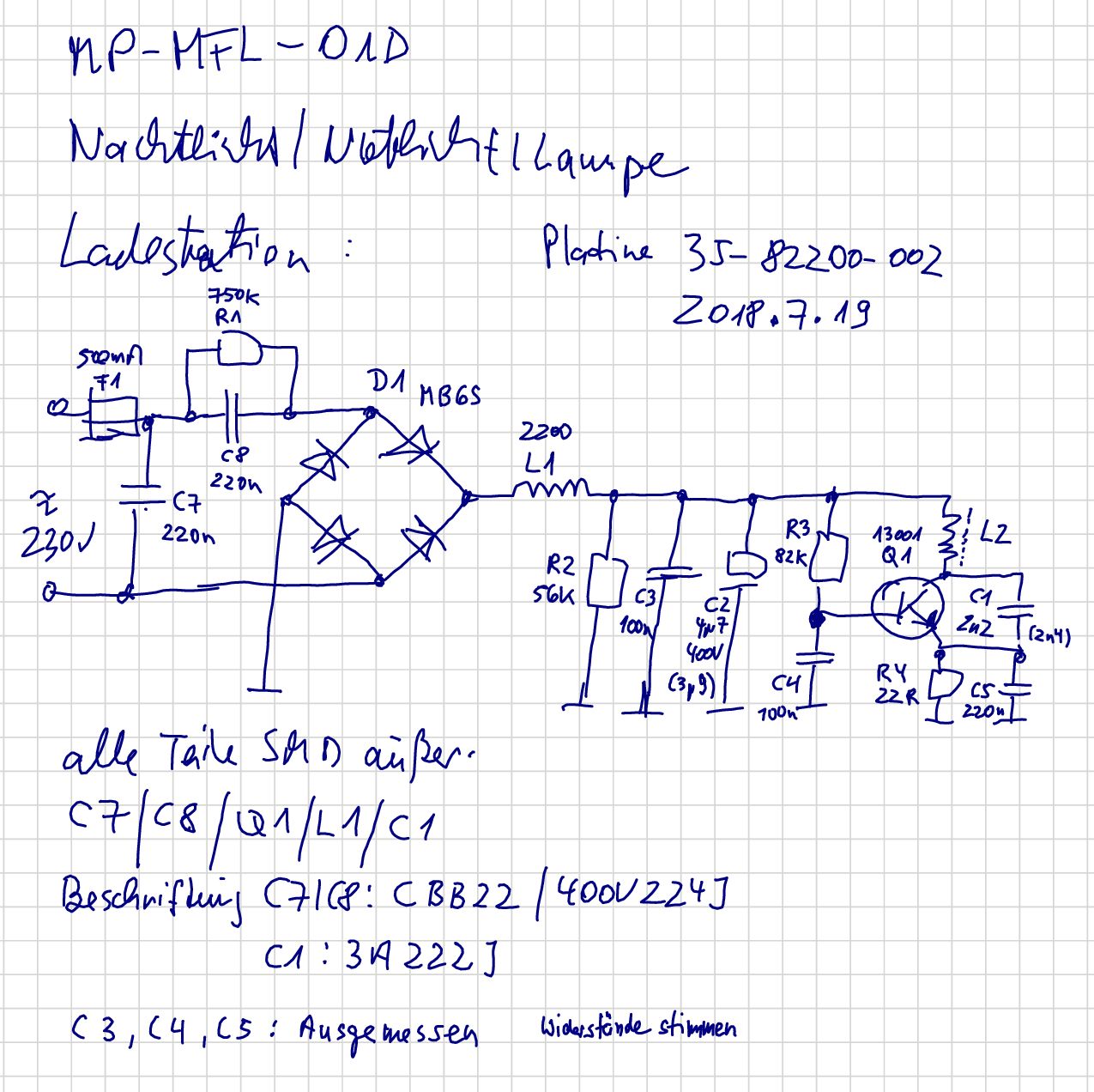 Hallo, in Beitrag "Reparaturanleitung aufladbares LED Nachtlicht mit Taschenlampe und Notlichtfunktion" wurde eine "Reparatur"anleitung zu dem von einem Discounter vertriebenen Akku-LED-Nachtlicht-Notlicht-Taschenlampe mit induktiver Aufladung von Northpoint oder Lightway - NP-NFL-01D ArtNr. 819028 XII/22/2022 oder X11/22/2022 - gepostet. Der darin enthaltene Verweis auf eine Problematik im Induktions-Lader einer früheren Version bezieht sich möglicherweise auf https://www.dampfradioforum.de/viewtopic.php?f=8&t=18015&p=261586&hilit=LED+Orientierungs#p261586 Das mir gegebene Gerät hatte zunächst denselben "Defekt" - nach versuchsweisem Ablöten des Akkus lief es wieder. Der Akku ist aber ziemlich aufgebläht und hat nur noch eine geringe Kapazität. Also habe ich mir mal das Aufladen betrachtet: In der Lampe hängt an der Spule eine Villard-Schaltung. Diese geht zum einen direkt auf den Akku - also ohne irgendeine Ladeschaltung (das muß doch über kurz oder lang jeden Akku ruinieren) - und zum anderen an eines der beiden nicht gekennzeichten 8pol-ICs und signalisiert diesem anscheinend, daß die Lampe in der Ladeschale steckt und "geladen" wird. Denn dann führt die enrtsprechende Leitung ca. 5V und schaltet einen Transistor, der wiederum einen Pin eines der ICs mit Masse versorgt. Aber: Ohne angeschlossenen Akku liefert die induktive Aufladung, also die Villard-Schaltung, nur eine Spannung von ca. 2,5V ( wie gesagt ohne Akk - Kabel abgelötet). Das sog. Nachtlicht, die Flächenbeleuchtung, leuchtet zwar - aber naturgemäß bei nur 2,5V nicht sehr hell. Das genügt natürlich nicht, um den Akku zu laden. Liegt es an der Empfängerschaltung, der Villard-Spannungsverdopplerschaltung? Die Dioden sind o.k. durchgemessen, die C sehen "gut" aus und sollten nach nur 2 Jahren auch nicht kaputt sein - auslöten und nachmessen bringt nicht viel, da ich die Soll-Kapazität nicht kenne. Oder ist es die Senderschaltung? In dem obigen link zu der früheren Version sind die Ausfälle der Konsensatoren in der Senderschaltung offensichtlich. Aufgeschraubt habe den hiesigen Sender, die Schaltung ist physisch ganz anders aufgebaut (siehe Fotos), aber ich kann kein Defekt der Bauteile feststellen. Der Gleichrichter scheint zu funktionieren (durchgemessen) zumal da die Schaltung zumindest soweit funktioniert, die R haben die Soll-Werte, die C auch bzw. die gemessenen Wert wirken "pausibel", ausgenommen der Ladelko, der nur ca. 4u hat, was aber noch in der Toleranz liegt. Und auch der Transistor wirkt durchgemessen o.k. und da in der Lampe überhaupt etwas ankommt, kann der Transistor nur schwerlich defekt sein. Die Schaltung als solche ist mit Ausnahme der RC-Kombi parallel zum Lade-Elko identisch, nur die Werte sind anders (siehe Schaltbild). Da mein Skop geerdet ist und ich keinen Trenntrafo habe kann ich leider nicht nachschauen, wie es nach dem Gleichrichter oder an anderer Stelle aussieht. Daher: Wie kann ich zur Fehlersuche weitermachen?