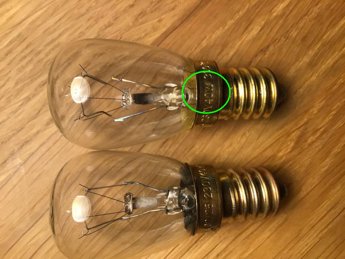 Hallo, gestern ist die niegelnagelneue Backofenlampe - exakt diese hier: https://www.conrad.de/de/p/paulmann-gluehlampe-230-v-e14-40-w-eek-g-a-g-1-st-2899357.html - während ihres ersten Backbetriebs beim Aufheizen auf 170°C nach ca. 5min mit einem lauten Knall und blauem Lichtschein explodiert. Der Ofen war nicht mal richtig heiß. Die Sicherung (Siemens N L 20A) für Backofen-Herd-Kombi und Waschmaschine ist dabei rausgeflogen. Der schmale Glasstift mit den drei Glühwendelhaltern ist zusammen mit ca. 2mm Material des darunterliegenden Glassockel, aus dem die beiden Metallstäbe ragen, von diesem abgesprengt; die beiden Metallstäbe ebenso. Den Glaskolben hat es nahezu komplett zerlegt. Mal sehen, wie ich den Sockel aus der Fassung rausbekomme. Die vorherigen beiden Lampen hatten eine andere Bauform, wie diese hier: https://amzn.eu/d/c1N4a2v, haben 0,5-1 Jahr gehalten, sind bei ihrem Ableben allerdings nicht explodiert. Woran kann das liegen? Wo gibt's robuste Backofenlampen? Grüße, Markus