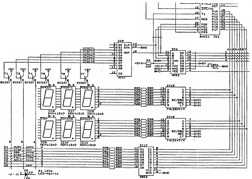 ...ich habe mich wirklich gefragt, wie das vom Programmablauf her wohl überhaupt funktioniert, dass man kein LED-Ghosting hat, während man die entsprechende "Spalte" für das Muxing mit dem Zähler anwählt, aber das ist wirklich ganz geschickt gelöst: Im 47247 sind BCD 1111b alle Segmente aus und die LED-Matrix unten links ist so aufgebaut das ein 11111111b auf dem 8-Bit Bus des Controllers ebenfalls dazu führt das keine LED leuchten kann - sehr geschickt angeordnet...so kann man die entsprechende Spalte auswählen ohne dass bereits etwas leuchtet... Ablauf wäre also rein dafür für einen Mux-Zyklus: 8-Bit Bus auf 1111 1111b (alles aus) Zähler zur gewünschten Spalte bringen BCD Werte für beide 74247 oder LED Code für die Matrix anlegen Ich würde es wahrscheinlich so machen, dass ich zudem in jedem Mux Zyklus eben schnell eine Zeile Tasten abchecke bevor ich die nächste High-Side der "Spalte" aktiviere...augenscheinlich ist es wohl so geplant dass man ein Bit auf dem 8-Bit Bus durchlaufen lässt und dann jeweils bei Pin 13 (T1) schaut ob die Taste gedrückt ist...