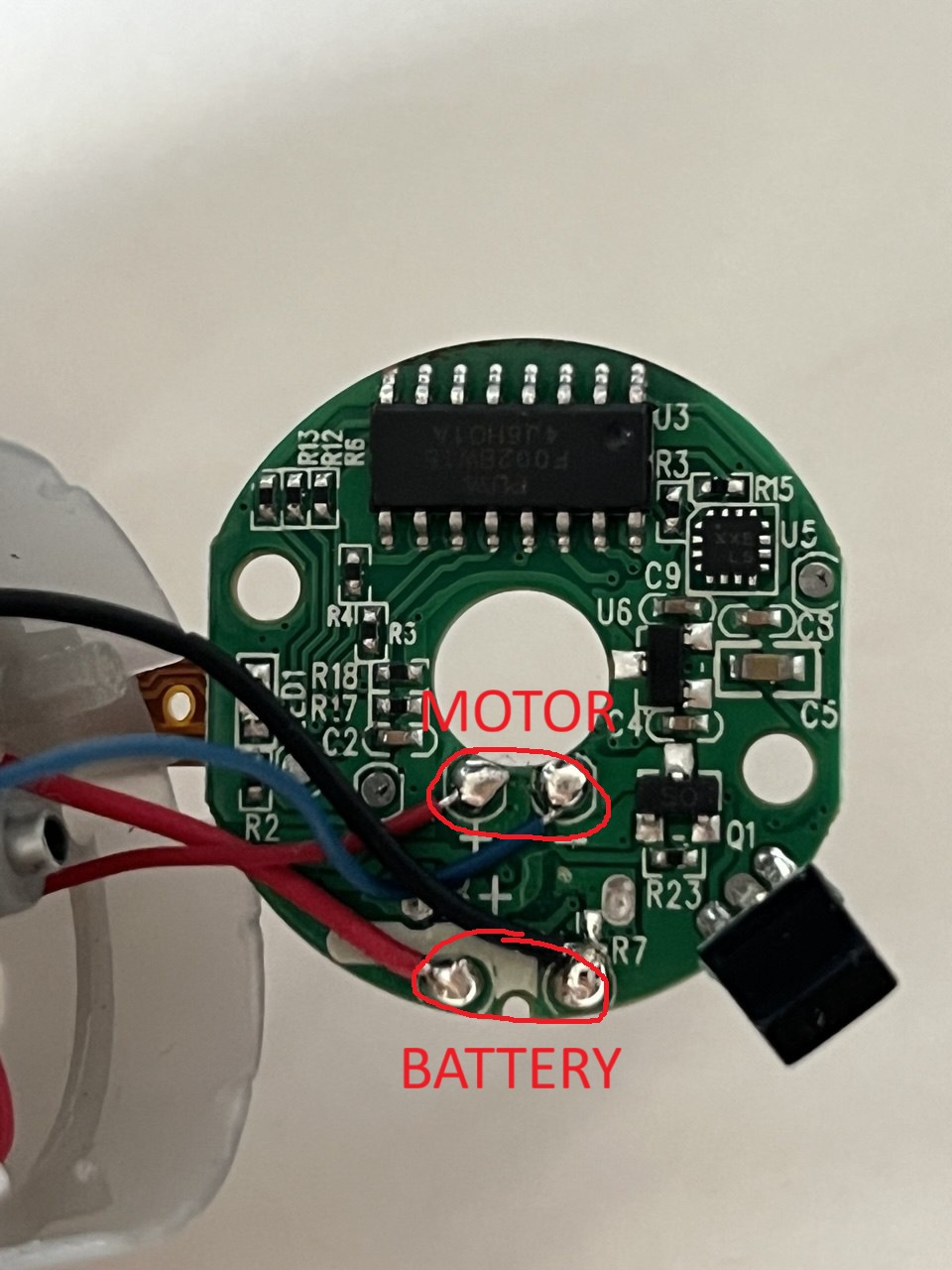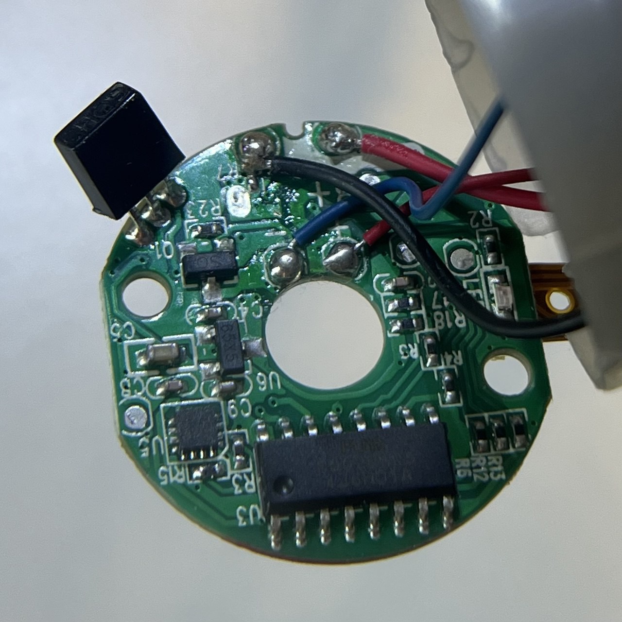 Hey zusammen, ich bin neu hier im Forum (überhaupt kein Elektronikexperte) und würde gern ein kleines Spielzeug für meinen Neffen reparieren. Bei dem guten Ding handelt es sich um einen sogenannten "Boomerang Ball" der Firma Semai (siehe Foto). Das Teil ist nicht wirklich kompliziert: Wenn man es schüttelt, fängt der Propeller an sich zu drehen und der Ball fliegt in die Richtung, in die man ihn gerade hält. Wenn man es erneut schüttelt, stoppt der Motor wieder. Wenn man es nicht gefangen bekommt, knallt der Ball beim Fliegen dann natürlich gegen alles, was so im Weg steht, aber es macht erstaunlich viel Spaß damit zu spielen... :D Jetzt zu dem Problem: Nach dem Einschalten und anschließenden Schütteln springt der Motor an, aber nach etwa 2 Sekunden hört er direkt wieder auf und macht dann gar nichts mehr. Wenn man das Ding aus- und wieder einschaltet, genau dieselbe Situation. Ich habe die Hoffnung, dass eventuell nur ein Bauteil kaputt ist, dass man einfach austauschen kann? Vielleicht irgendein Beschleunigungssensor oder etwas Ähnliches? Irgendwie muss das Schütteln ja erkannt werden? Vielleicht das dickere schwarze Teil am Rand der Platine (oben steht dort "CHQD" drauf)? Ich habe aber wie gesagt überhaupt keine Ahnung, aber vielleicht kann ja hier jemand Licht ins Dunkle bringen. Ansonsten denke ich, dass der Akku (240mA 3,7V) nicht das Problem sein sollte. Nach voller Aufladung liefert er 4,1V und die LEDs blinken die gesamte Zeit fröhlich.