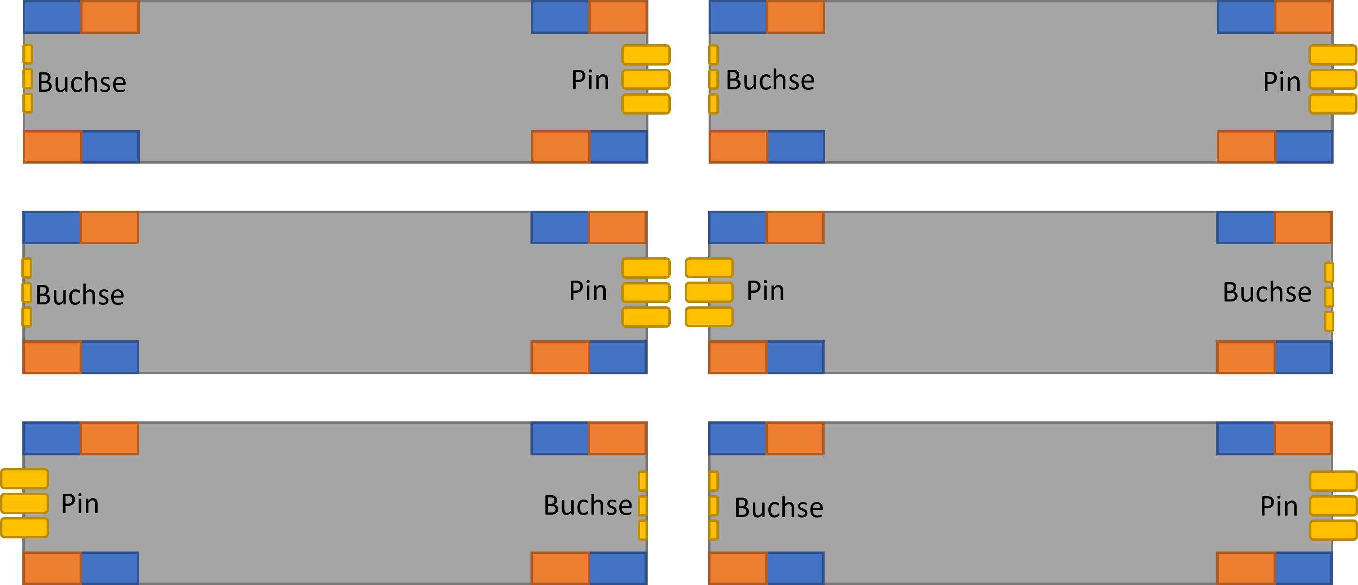 Legende: #o bzw. o# sind "Pogopins", d.h. Federverbindungsstifte c bzw. ↄ sind die leicht konkaven Gegenstücke dafür *) Es geht um eine Modelleisenbahn. Da kann vorne/hinten beliebig getauscht werden, aber oben und unten sind fest vorgegeben; Räder hats halt nur unten.