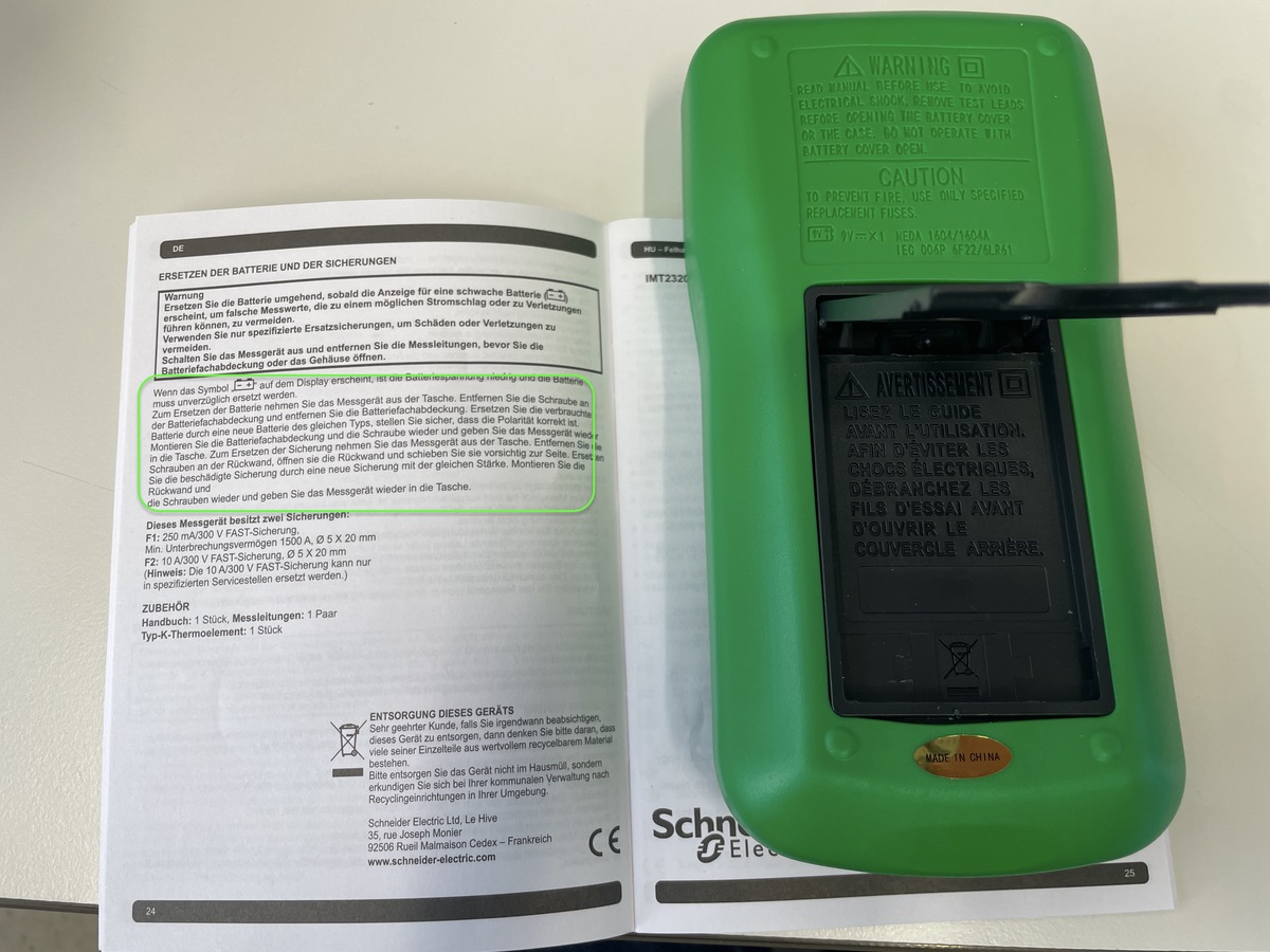 Hallo zusammen, wer kennt sich mit solchen Multimeter von Schneider Elektrik aus. Ich finde nicht die Schraube, um an das Batteriefach zu kommen. Auch unter dem "Made in China"-Aufkleber ist nicht zu finden. Danke euch...