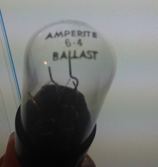 Torsten B. schrieb: > Nebenbei: V6 ist eine #6-4 AMPERITE 6-4 BALLAST TUBE > mit ca. 6 Ohm, vermutlich ein 600mA-Konstantstromquelle. Das ist im Prinzip nix anderes als eine mit Unterspannung betriebene Glühlampe die durch PTC Verhalten des Glühfadens einen annähernd konstanten Strom zieht. Eine leicht gebrauchte hab ich noch hier liegen. Wenn sie jemand brauchen kann: 5€ plus Versandkosten.