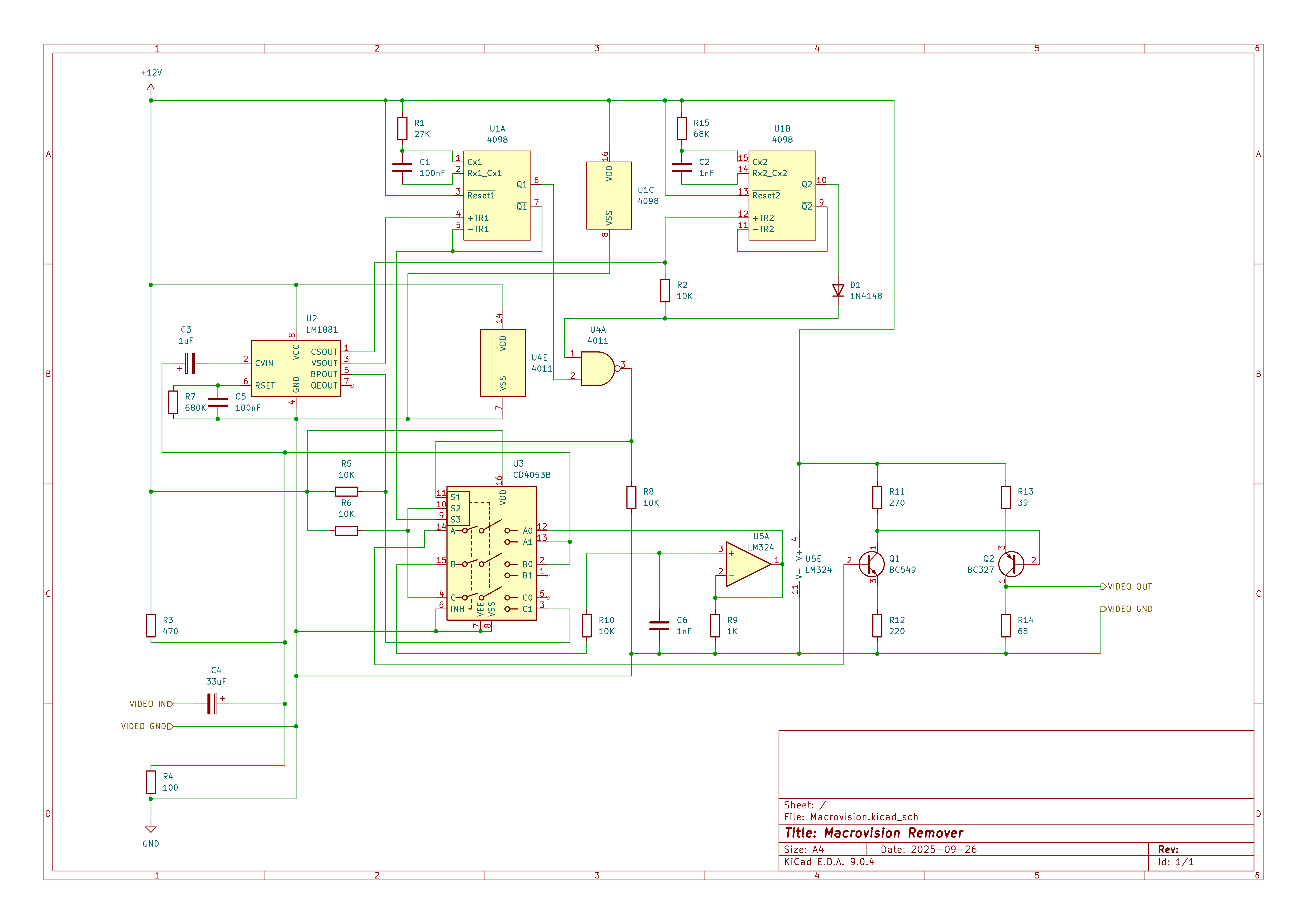 Hallo zusammen, ich habe folgende Schaltung (siehe Link) nachgebaut. https://hbo.tripod.com/VCR/en_macrovision.htm Den Schaltplan (siehe Foto) habe ich nachgezeichnet, da mir der originale viel zu unübersichtlich war. Leider muss im Schaltplan ein oder mehrere Fehler vorhanden sein. R14 wird nach kurzer Zeit sehr heiß. Das Schaltbild von Q2 ist spiegelverkehrt? Die Stromaufnahme bei 12V beträgt ca. 200mA.