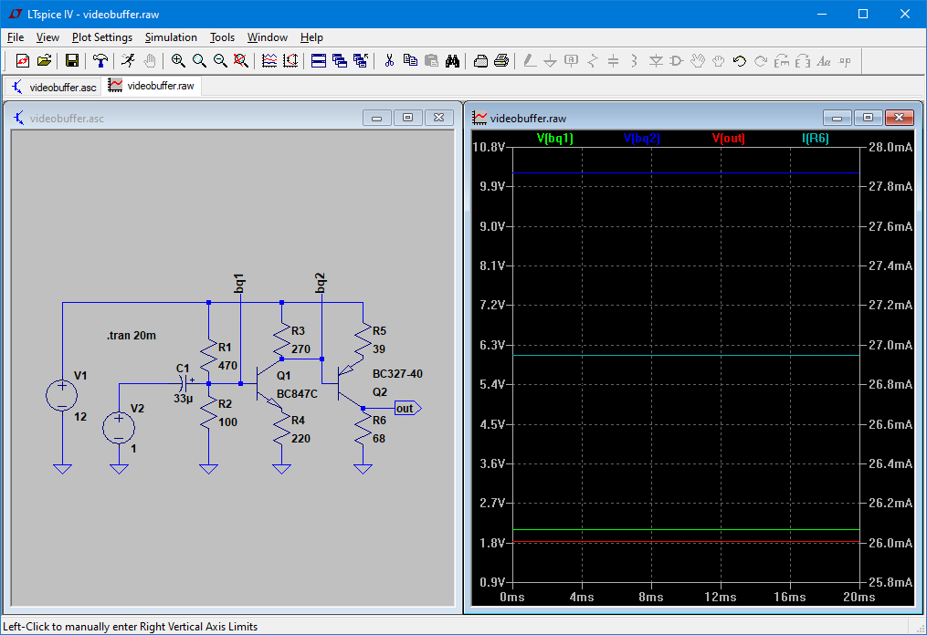 Paul schrieb: > Habe gerade Basis von Q1 auf Pin 13 gelegt. > > AV Eingang: 1,9V > AV Ausgang: 1,9V Das passt ziemlich gut zum Erwartbaren. Siehe Screenshot der Simulation. > Die Widerstände und Transistoren werden nicht mehr merklich heiß. So sollte es sein. In dem 68Ohm-Widerstand sollten nur so ca. 50mW verheizt werden. > Stromaufnahme: 80mA Hmmm... Kommt mir etwas viel vor, allerdings habe ich jetzt keine Lust, Angaben zum Stromverbrauch von LM324 und LM1881 zu beschaffen. Das überlasse ich dir. Die CMOS-ICs 4053 und 4011 kannst du jedenfalls in den Skat drücken, die ziehen so gut wie nichts (so lange sie heile sind). Und der Videobuffer zieht knapp 55mA. Bleibt also zu klären ob der LM324 und der LM1881 zusammen 25mA ziehen dürfen.
