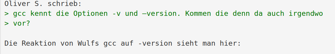 Oliver S. schrieb:> gcc kennt die Optionen -v und —version. Kommen die denn da auch irgendwo> vor?